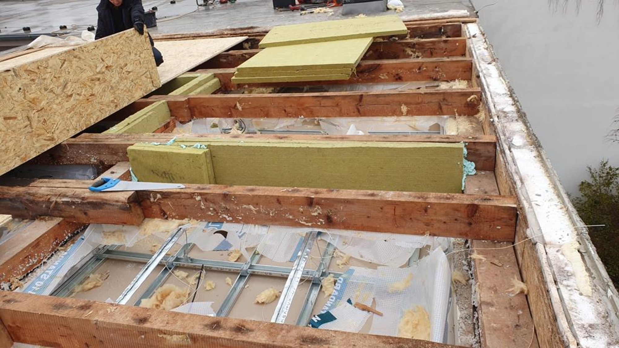 Před provedením nového záklopu bylo nutné provést několik úprav stávajících konstrukcí, především odstranit starou tepelnou izolaci a vzduchotěsně uzavřít koruny příček. Z akustických důvodů se příčky propojily se záklopem tuhými deskami z minerálních vláken.