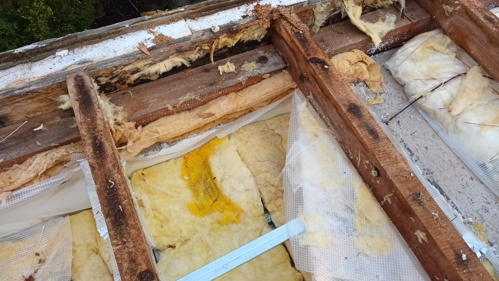 tepelná izolace z minerální vaty vložená mezi dřevěné trámy