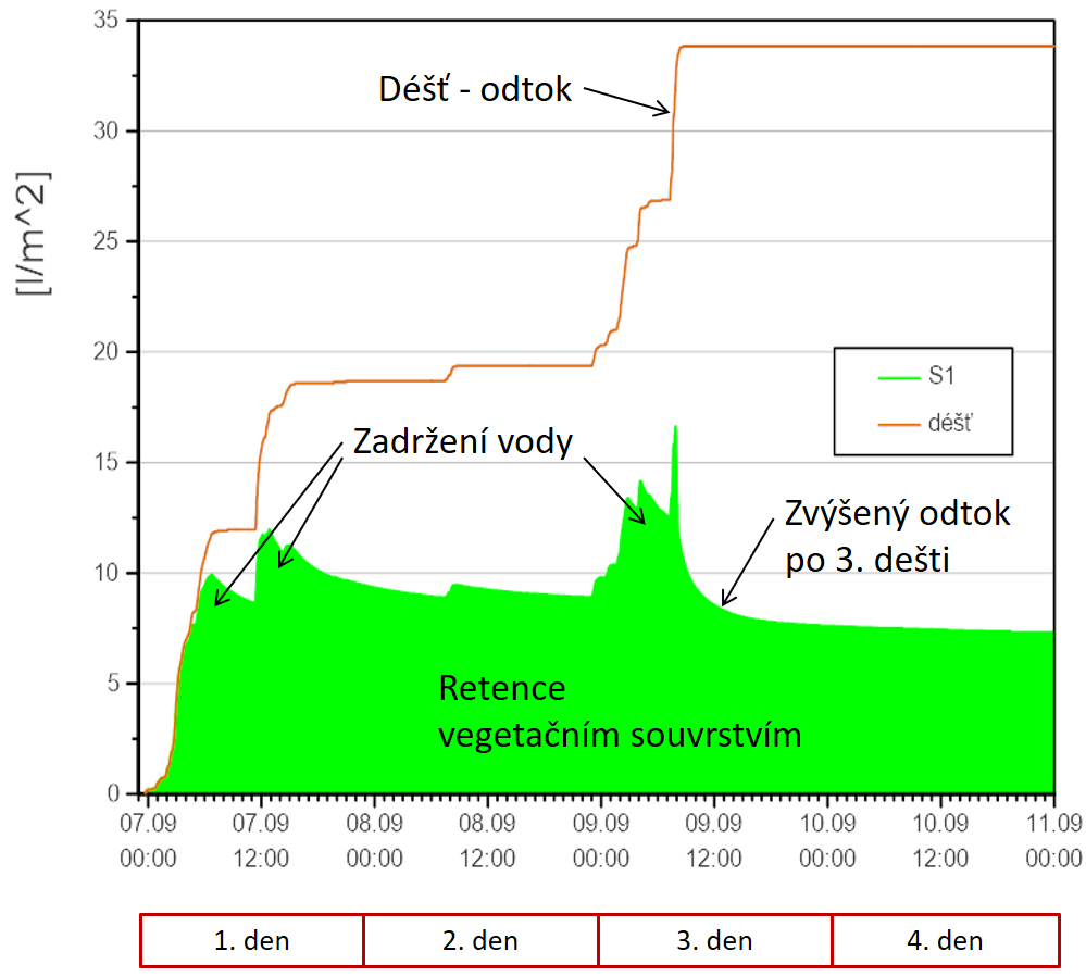 Z výše umístěných grafů je zřejmé, že se retenční vlastnosti v průběhu deštivého období mění. Na Obr. 13 je zeleně vybarvena oblast, která odpovídá retenčním schopnostem střechy během deštivého období. Z toho průběhu lze odvodit, že po určitém stavu nasycení skladby vodou již není schopna střecha akumulovat žádné srážky a veškerá voda téměř plynule odtéká.