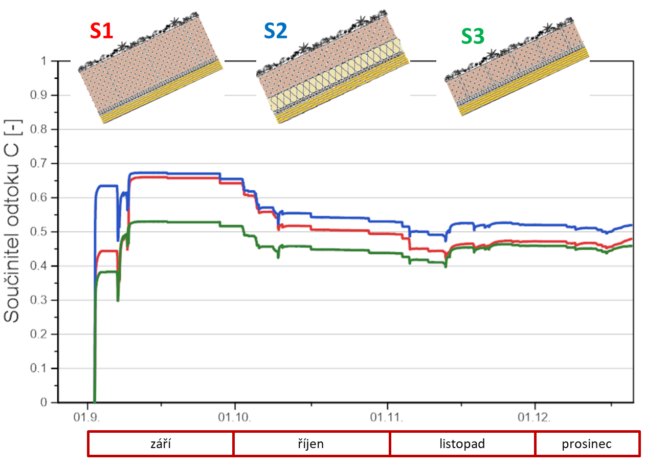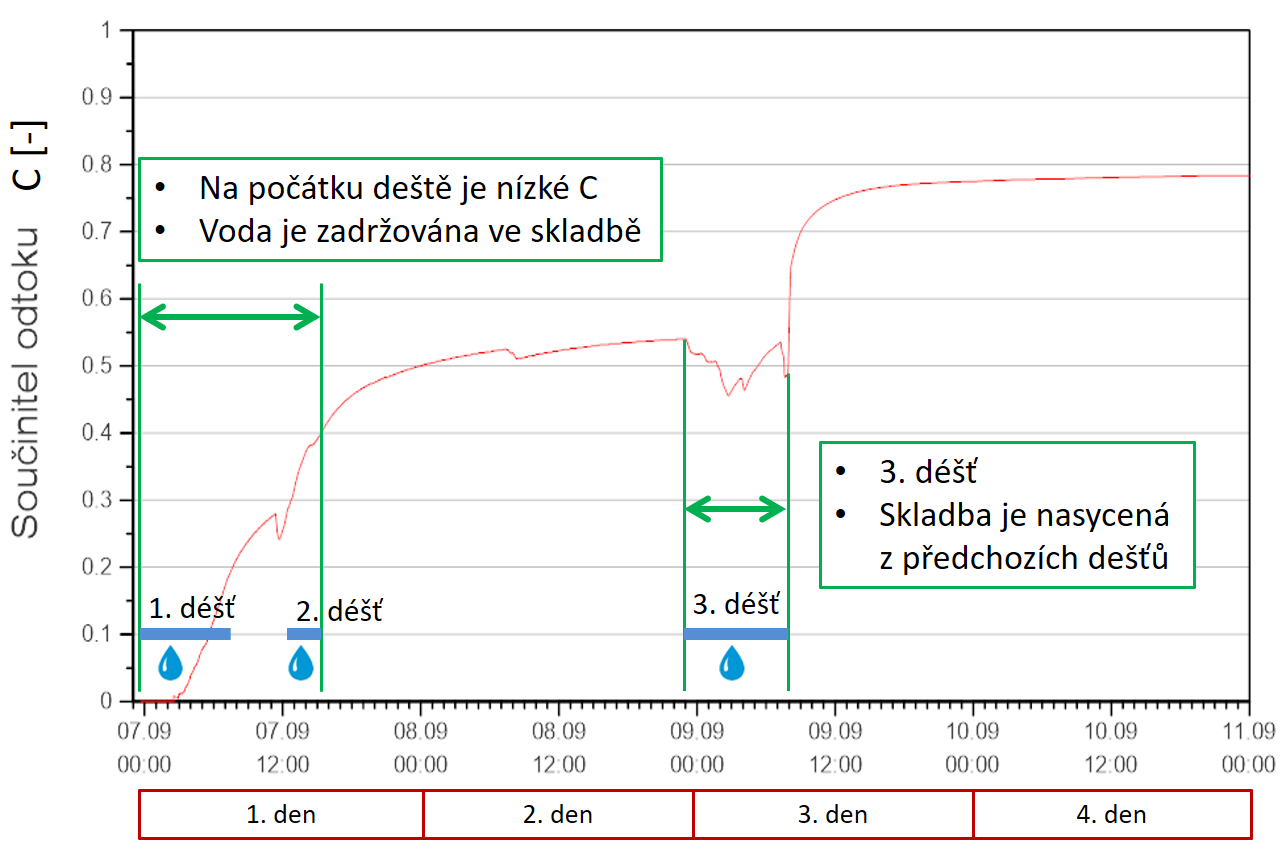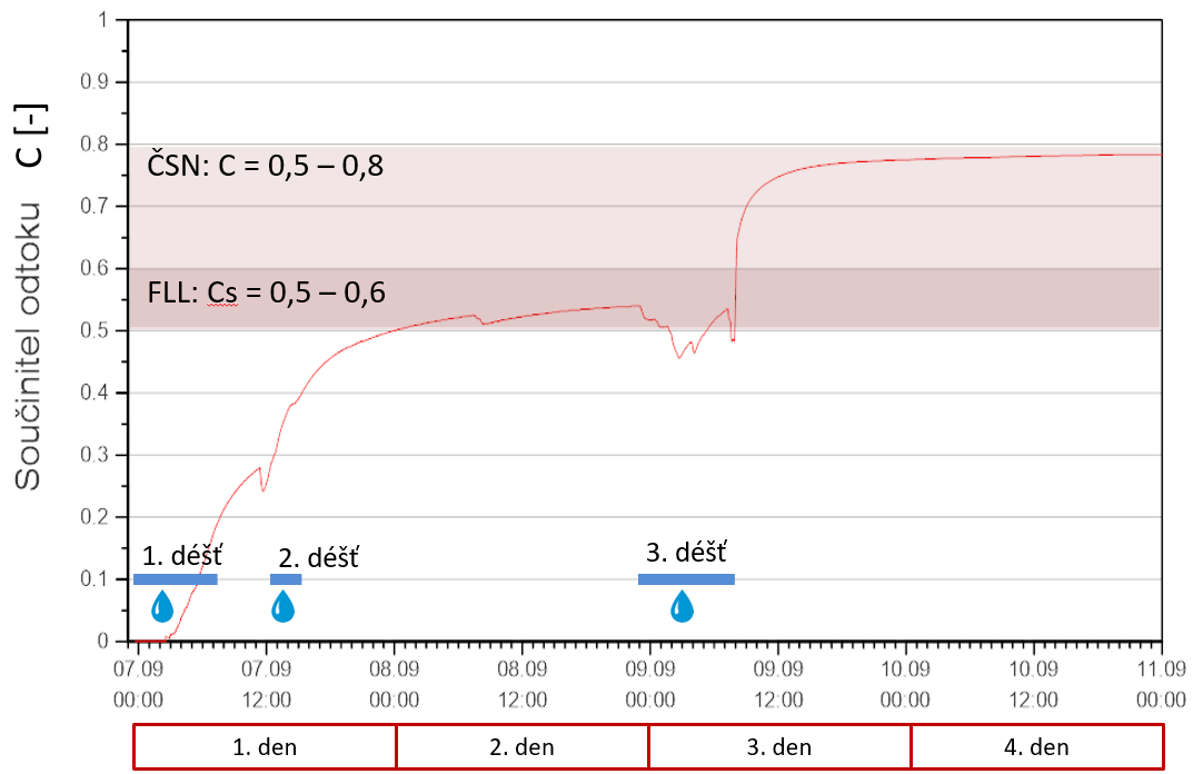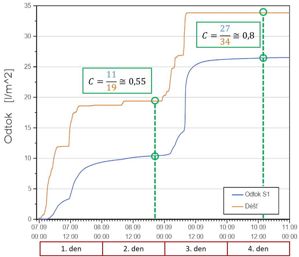 Z dlouhodobých měření již víme, že při mírném dešti je z velké části voda zadržena v substrátu, kde je využita rostlinami, nebo se odpaří. V takových případech se může pohybovat součinitel C i okolo hodnoty 0,15. Jinak se však skladba chová při intenzivním dešti, nebo při opakovaných deštích během deštivého období. Poté, co dojde k nasycení vegetační vrstvy vodou, se výrazně zvýší její odtok. Pro názornost je na Obr. 7 vidět vývoj odtoku vody na šikmé střeše během tří deštivých dnů. Modře odtok z vegetační střechy, oranžově odtok ze střechy bez vegetačního souvrství. Pokud bychom posbírali veškerou odtékající vodu na konci druhého dne z obou střech a vypočítali součinitel C, tak bychom dospěli k výsledku C = 0,55. Pokud bychom to samé udělali čtvrtý den, tak by nám součinitel C narostl již na hodnotu 0,8. Celkový průběh součinitele C je vidět na Obr. 8. Z tohoto průběhu součinitele C, resp. retenčních schopností vegetační střechy je jasné, že předpokládat jedinou hodnotu součinitele C je velmi nepřesné. Je také klíčové určit dobu, za kterou bude tento součinitel stanoven. Maximální hodnoty budou naprosto odlišné od průměru z definovaného období.