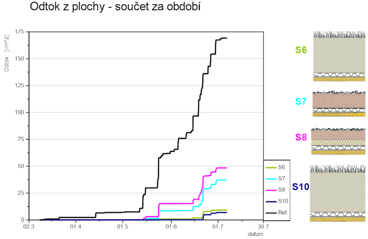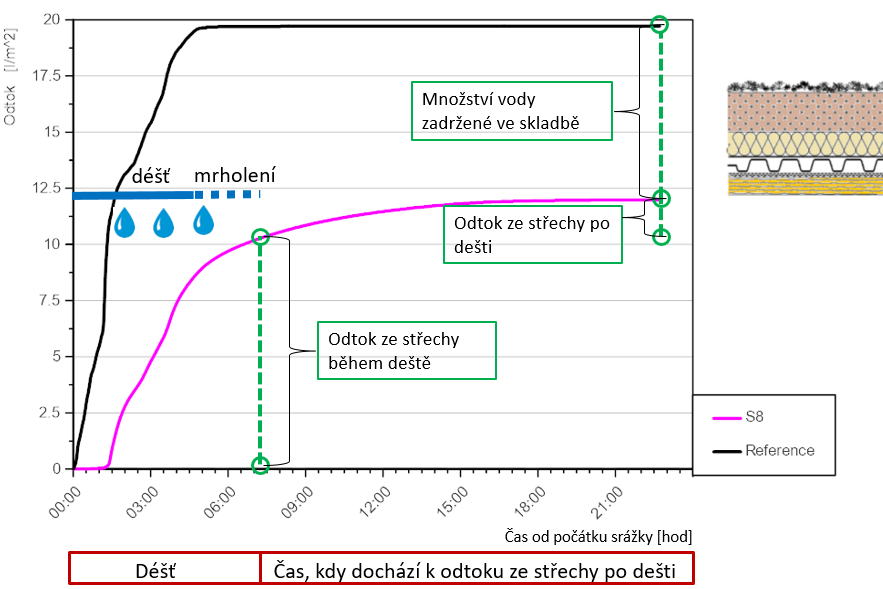 Výsledky z měření také potvrzují předpoklad výrazného pozitivního přínosu v letních obdobích s náhlými krátkodobými přívalovými dešti, kdy je schopna vyschlá skladba střechy krátkodobě naakumulovat velké množství vody, které se následně odpaří nebo s významným zpožděním odteče ze střechy. Právě toto zpoždění odtoku vody umožní plynulejší odvedení vody do kanalizace nebo vsakovacích zařízení.