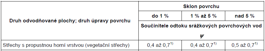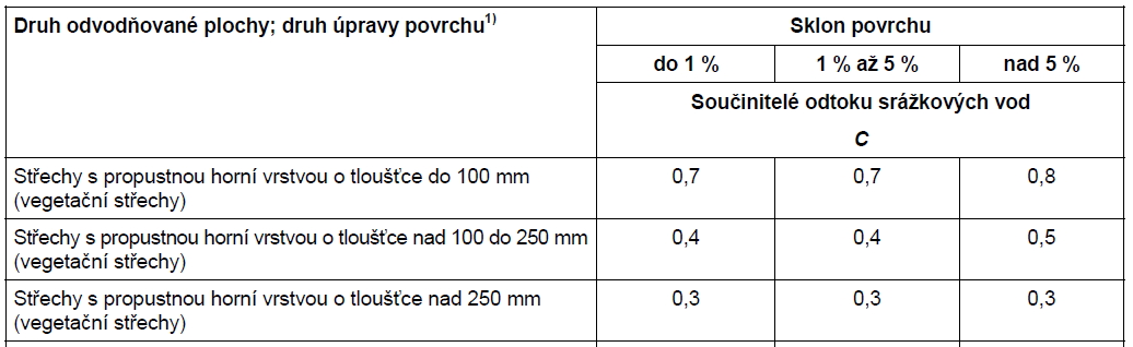 V publikaci [13] je uvedena souhrnná tabulka, viz Obr. 5, ve které jsou porovnány hodnoty součinitele odtoku z vegetační střechy podle související německé, rakouské a české normy [7] a podle směrnice pro zelené střechy [11]. Tabulka rozlišuje mezi špičkovými a průměrnými (ročními) hodnotami a dále dělí hodnoty podle sklonu střechy a mocnosti vegetačního souvrství.