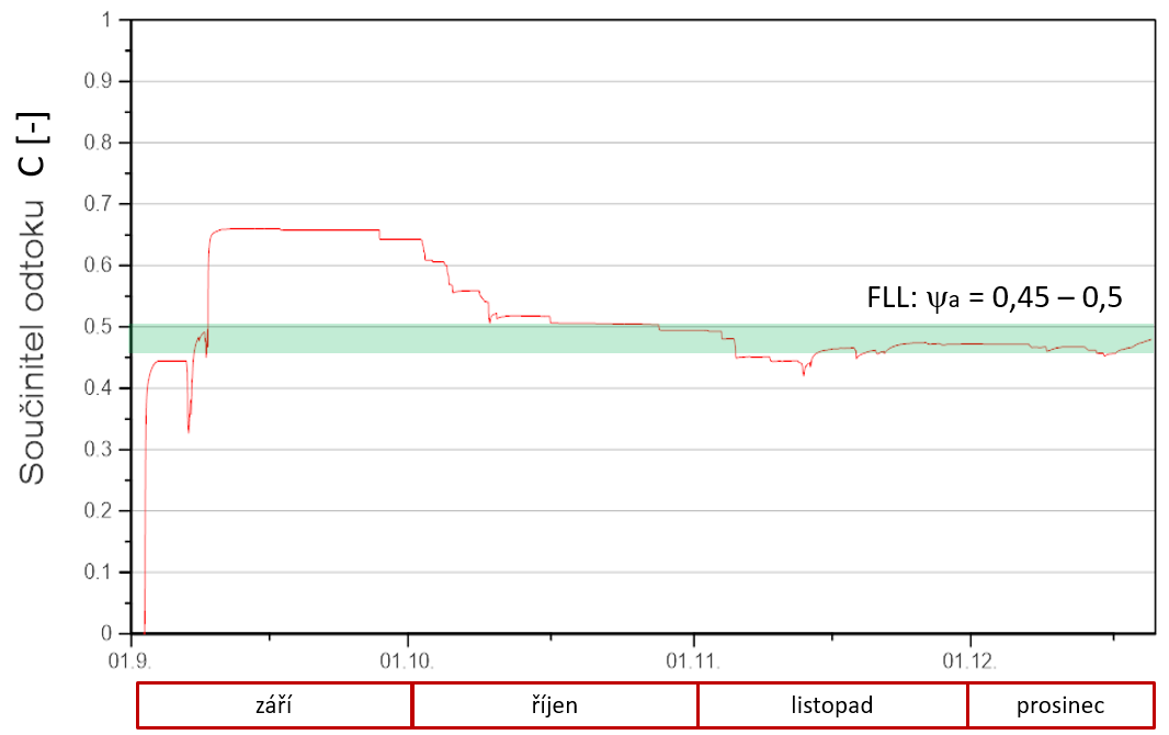 V dlouhodobějším horizontu se průměrná hodnota C snižuje díky mírnými krátkodobými dešťům, při kterých se voda vsákne do vegetačního souvrství a ze střechy odtéká pouze malá část vody. Tato vlastnost je patrná z Obr. 11, kde je vidět průběh z měření součinitele C během období září až prosinec roku 2019. Proto i metodika FLL uvádí orientační hodnoty pro stanovení ročního (dlouhodobého) součinitele odtoku C (dle [11] se značí a). Na Obr. 12 je patrné, že pro sledovanou skladbu šikmé vegetační střechy mají změřené hodnoty dobrou shodu s hodnotami ročního součinitele odtoku a dle FLL [11].