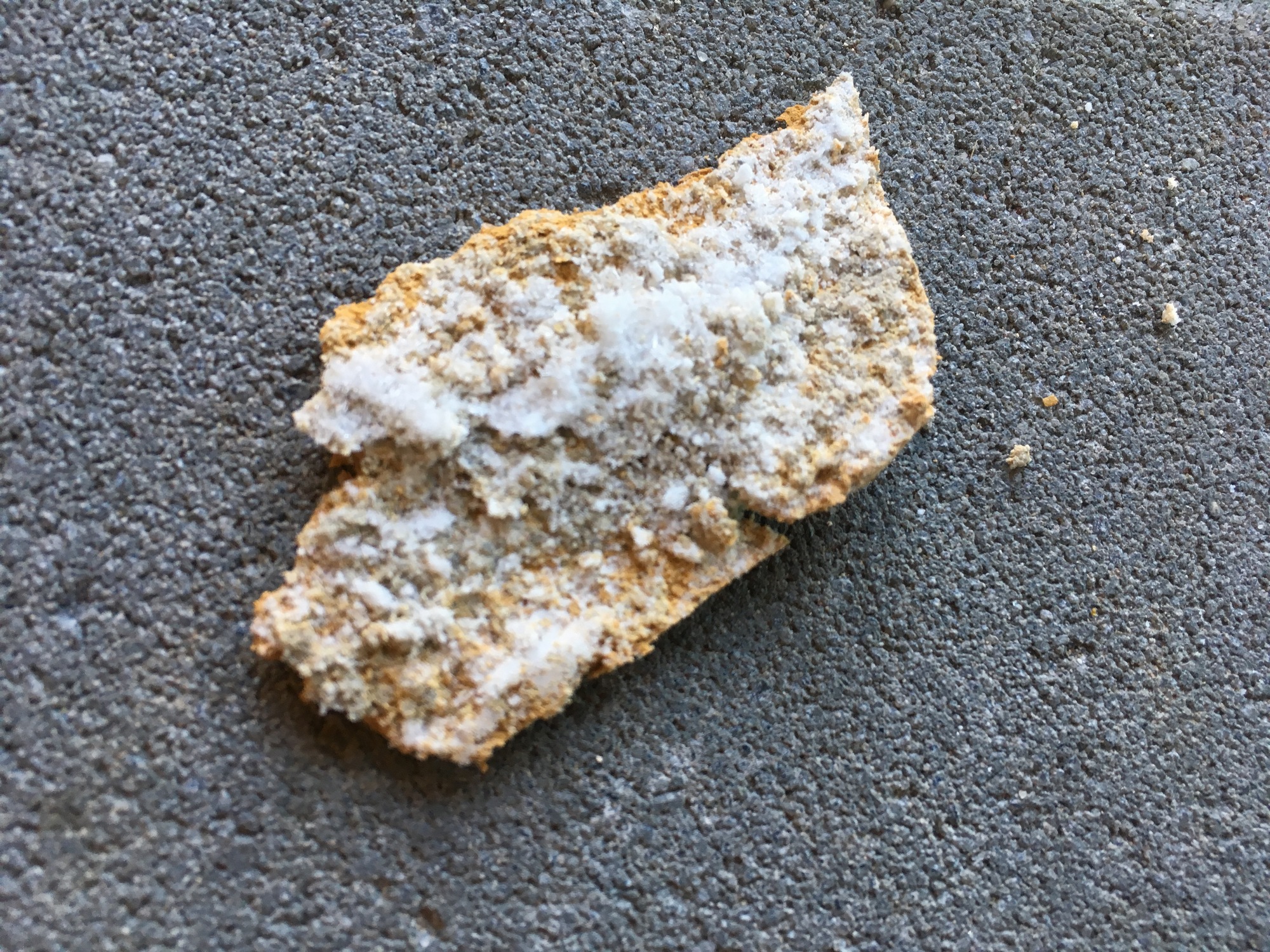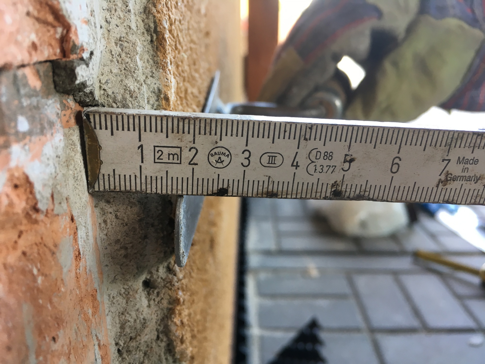 Sonda byla provedena na severovýchodní stěně pod střechou parkovacího stání. Poloha zřetelně viditelné vlhké mapy ve výšce 50 cm nad úrovní chodníku odpovídala poloze ložné spáry mezi 1. a 2. řadou cihel. Po odebrání tenkovrstvé finální omítky je v místě puchýřů viditelná usazená sůl na podkladní jádrové omítce. Zjistili jsme, že jádrová omítka tloušťky 1,5 cm byla provedena v celé ploše stěny a zatažena až pod úroveň terénu na izolaci soklu z extrudovaného polystyrenu s naneseným stavebním lepidlem. Základní vrstva na soklovém extrudovaném polystyrenu z lepící hmoty a výztužné skleněné síťoviny byla vlhká. Extrudovaný polystyren byl ve hmotě suchý, ale na vnitřním povrchu mokrý. Zakládací malta pro zdivo z dutinových cihel nad hydroizolaci byla také suchá. Povrch základové konstrukce po odhalení tepelné izolace byl mokrý. Zjištěná geometrie detailu je znázorněna na schématu.