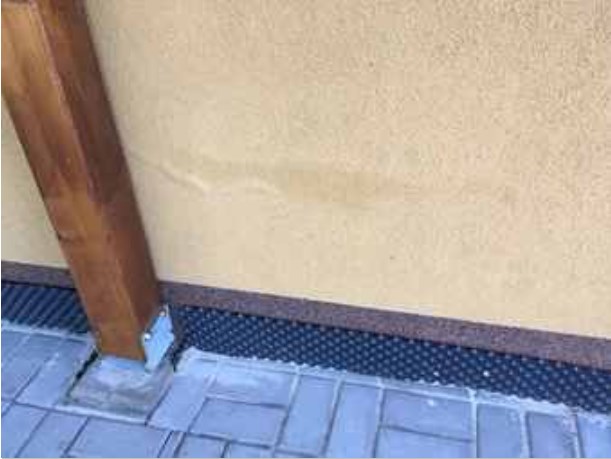 Již na první pohled bylo patrné, že zpevněné plochy mají lokálně spád směrem k domu. Mapy a puchýře v omítce se ale vyskytovaly převážně v místech, kde byl spád zpevněných ploch v pořádku. Z jedné strany k domu přiléhá přístřešek parkovacího stání, který chrání stěnu domu před srážkami. Přesto i pod ním se vlhkostní poruchy na omítce vyskytují. Bylo zjištěno, že dešťové svody ze střech jsou napojeny do lapačů střešních splavenin, dešťové odpadní potrubí vedoucí pod zemí do vsakovací jímky je však provedeno z flexibilního perforovaného potrubí. Dochází tak ke spolehlivému zavlažování obvodu stavby při každém dešti. Jak se ale voda dostane až do výšky přibližně 50 cm nad terén? Nemůže být zdrojem poruch voda rozlévající se po vodorovné hydroizolaci domu od netěsnosti některého z vnitřních rozvodů? Pro zodpovězení těchto otázek a bezpečné určení příčin bylo třeba provést destruktivní sondu v místě projevů poruchy.