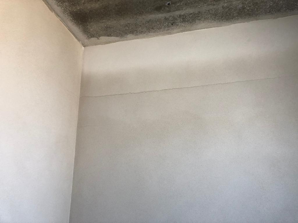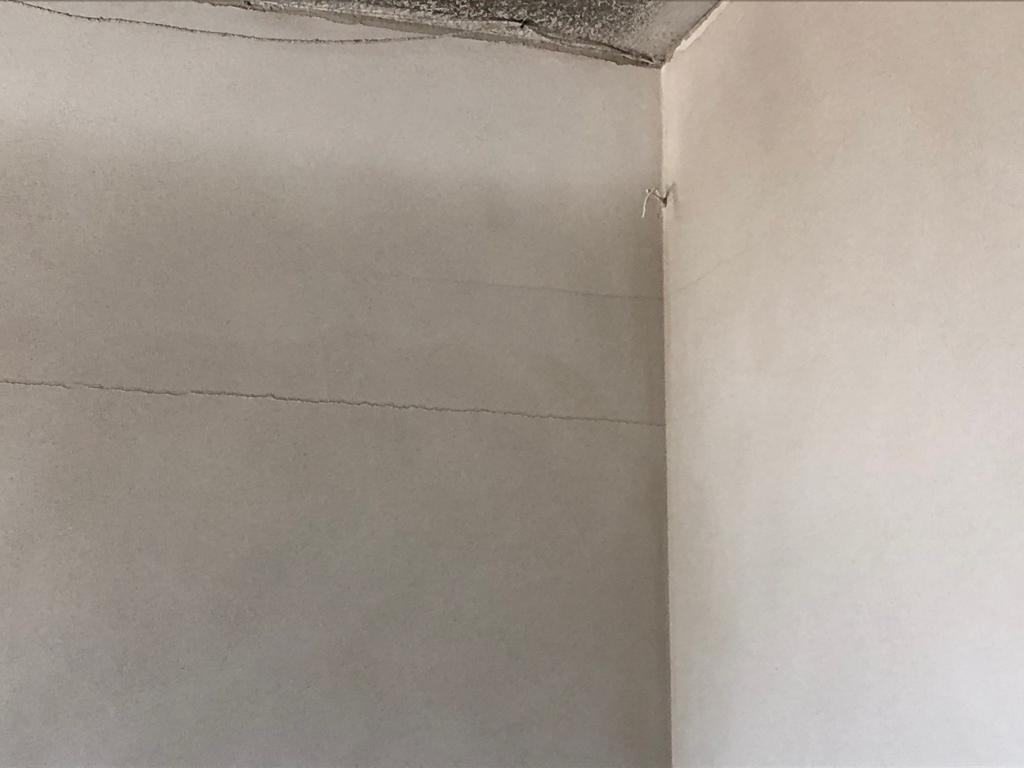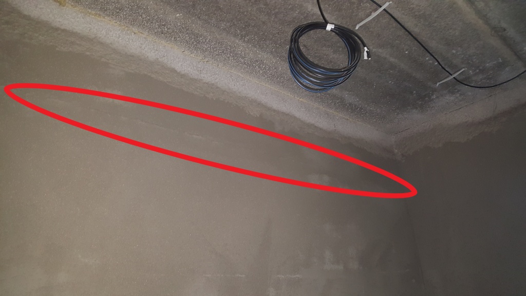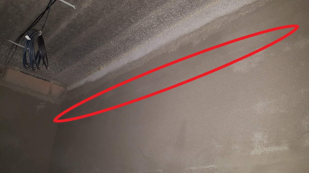 Při prohlídce hrubé stavby koncem července 2019 byly zjištěny vodorovné trhliny v čerstvé vnitřní omítce stěn pod nosnou konstrukcí ploché střechy (obr. /1/ a /2/). V době prohlídky byla ze skladby střechy provedena pouze provizorní hydroizolační vrstva z asfaltového pásu typu G200 S40 (obr. /3/), která měla poté ve výsledné skladbě střechy převzít parotěsnicí a vzduchotěsnicí funkci.