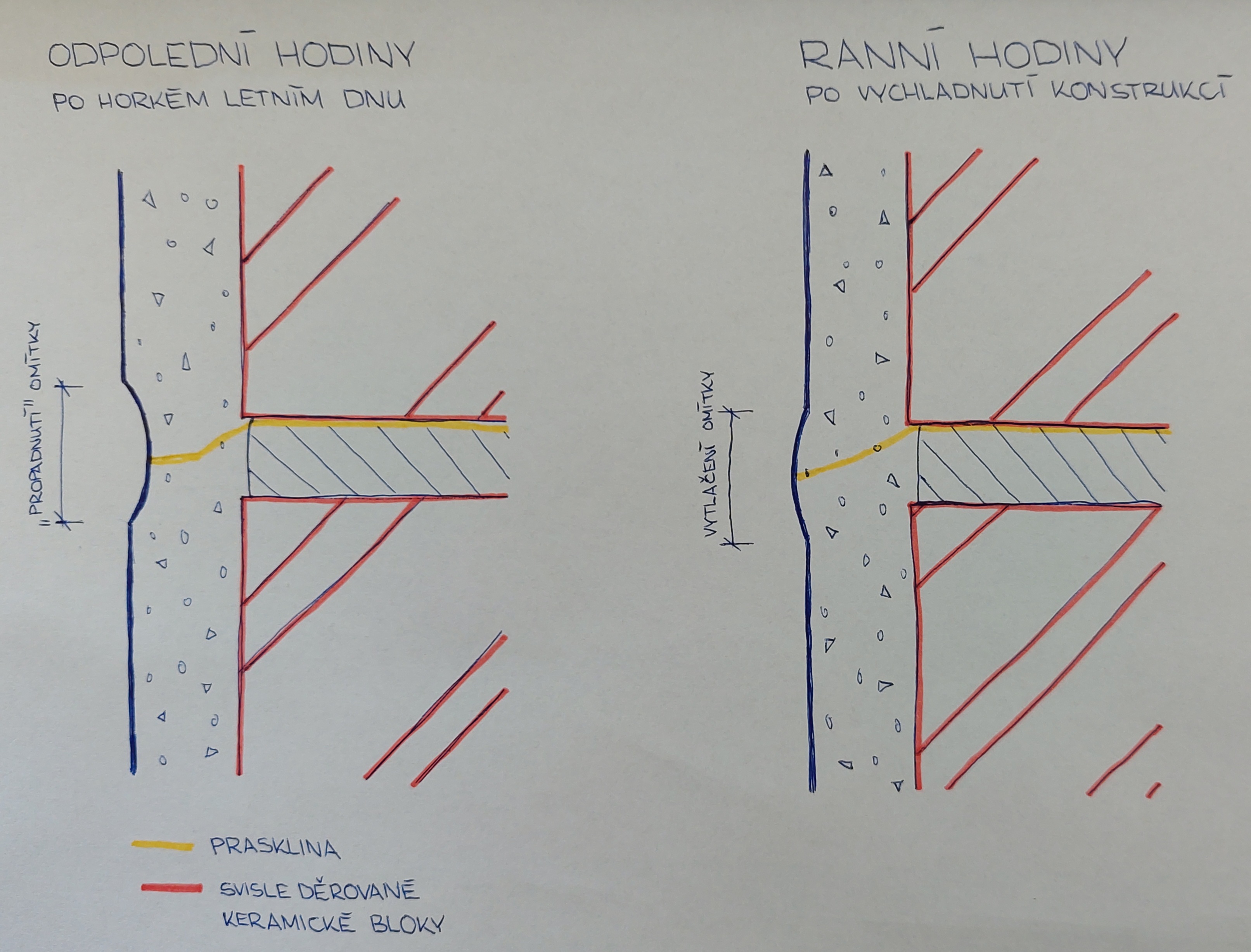 U výše popsaných staveb jsme došli k závěru, že dominantním vlivem, který způsobil poruchy (trhliny) omítek, bylo působení relativně vysokých teplot ve slunném letním období podpořené černým asfaltovým pásem na horním povrchu. Ohřátím horního povrchu panelů se zvětšilo jejich vzepětí. Strop pak nadzdvihl obvykle poslední řadu zdicích prvků na obvodové stěně nebo se odtrhl od příček. Výšková úroveň, kde dojde k odtržení, záleží na provedení návaznosti stropu na zdivo a na vzájemné soudržnosti jednotlivých vrstev mezi sebou.