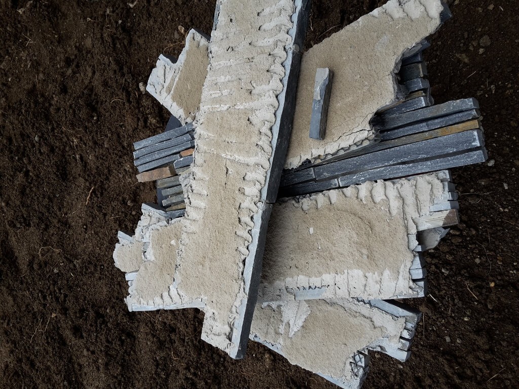 2. Špatná aplikace lepidlaNa stavbě rodinného domu na Šumavě byla veškerá doporučená „chemie“ dodržena, zákazník však již po 2 měsících od dokončení reklamoval odpadnutí několika tvarovek (viz obr. 12 a 13). Zjistilo se, že rubová strana odpadaných tvarovek je zcela čistá, jen u některých byly lehce patrné světlé pruhy. Dále bylo zjištěno, že lepidlo bylo nataženo v tloušťce výrazně nižší, než je povolené minimum a navíc nebylo naneseno celoplošně. O kontaktních vrstvách (viz odstavec Lepení) nemohla být ani řeč. Výsledkem tedy byla demontáž obkladu a nelepení znovu. Většina tvarovek šla použít znovu.