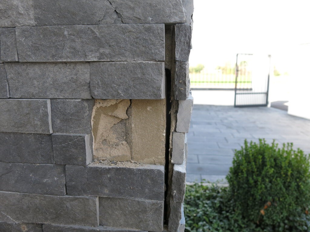 1. Nedostatečně vyzrálý podkladNa rodinném domě byl obklad Wallstone nalepen na sloupy vytvořené ze ztraceného bednění vyplněného vyztuženým betonem a vyrovnaného cementovou maltou. Bylo použito vhodné lepidlo i se systémovou penetrací, byl dodržen technologický postup lepení, přesto zákazník reklamoval, že mu obklad na sloupech nedrží. Při bližším ohledání se zjistilo, že kámen k betonovému podkladu drží více než pevně, nicméně betonový podklad popraskal (obr. 9 a 10). U realizační firmy se zjistilo, že betonový podklad nebyl starší než 14 dní. Vzhledem k tmavé barvě kamenného obkladu se celá konstrukce poměrně snadno zahřála, čímž došlo k pnutí, které nevyzrálý podklad nepřenesl. Obklad bylo třeba demontovat a po opravě sloupu znovu nalepit (obr. 11).