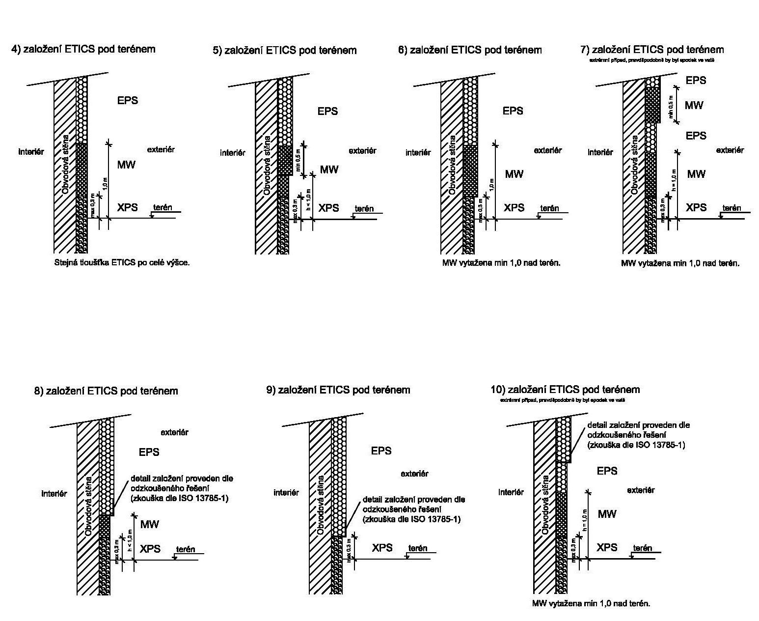 Nově je zapotřebí nad terénem do výšky 1,0 m použít tepelnou izolaci z minerálních vláken. Norma však připouští vyvedení "hořlavé" tepelné izolace např. DEKPERIMETER (tj. s třídou reakce mimo A1 nebo A2) maximálně 0,3 m nad terén. Přesněji to může být patrné na jednom z obrázku.