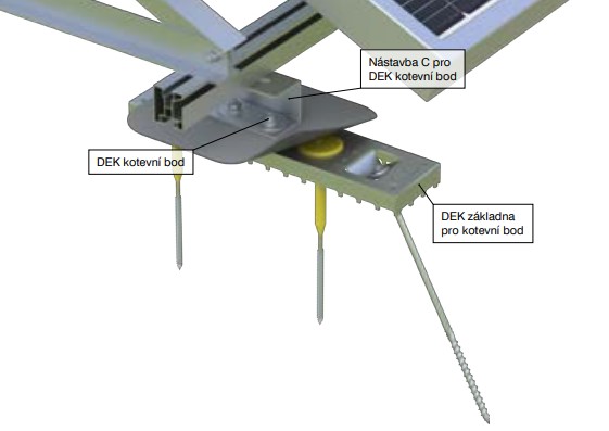 Ve snaze m.j. maximálně eliminovat dřevěné prvky zabudované v nevětrané skladbě střechy jsme v posledních letech vyvinuli pro obdobné kotvení nejen sněhových zachytávačů DEK kotevní bod. Ten se skládá ze základny pro kotevní bod a vlastního kotevního bodu. Tento nerezový kotvený bod zakončený PVC-P manžetou a dvěma systémově utěsněnými závitovými tyčemi kombinuje kotvení proti sání větru a kotvení proti smykovým silám vyvolaných třeba právě působením sněhu na šikmé střeše. Neobsahuje žádné dřevěné části. Dnes bychom již zcela jistě sáhli po tomto řešení a návrh i vlastní realizace by byl jednodušší a bezpečnější.