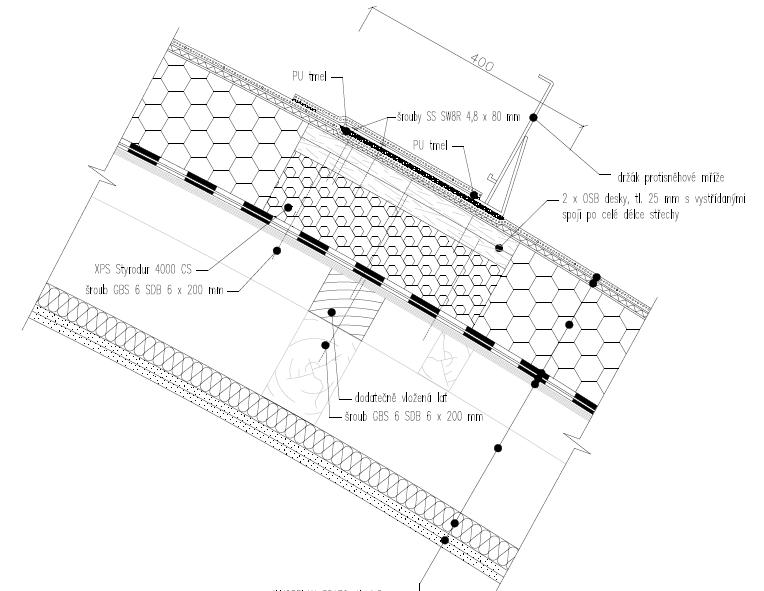 Zvláštní pozornost byla tehdy věnována detailu kotvení sněhových zachytávačů. Sněhové zachytávače byly liniově umístěny v několika úrovních po vrstevnici střechy. Držáky byly v místě kotvení podtmeleny PU tmelem a mechanicky kotveny skrz hydroizolační PVC-P fólii do dvojice OSB desek tl. 25 mm. Ty byly podloženy tepelnou izolací z XPS a kotveny přes tuto izolaci a parozábranu do dřevěného záklopu a vyztužujících dřevěných hranolů doplněných mezi nosnou konstrukci střechy. Celý detail byl zajištěn přířezem PVC-P fólie navařeným k hlavní hydroizolační vrstvě nahoře a po stranách. Ve spodní části, kde držák vystupoval z pod přířezu, byl ponechán přířez nepřivařený.