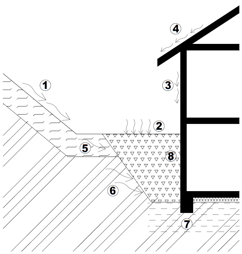Podsklepený objekt budovaný pod svahem má být orientován tak, aby tvořil co nejmenší překážku povrchové a vodě stékající po svahu a podpovrchové vodě prosakující po sklonitých a vodu vedoucích vrstvách horninového prostředí (vícekřídlé dispozice nenatáčet otevřenou stranou proti svahu).