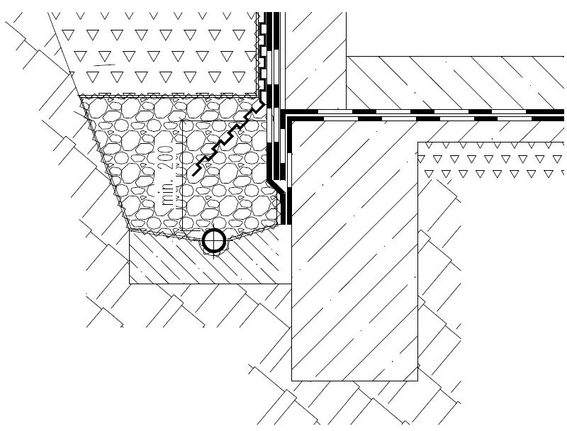 Svislá drenážní vrstva je zavedena do kameniva nad drenážním potrubím, čímž je zajištěno beztlakové předání vody do potrubí. Svislá drenážní vrstva je ukončena 150 mm pod úrovní terénu tak, aby bylo vyloučeno přivádění povrchové vody nebo vody z fasády do obvodové drenáže.