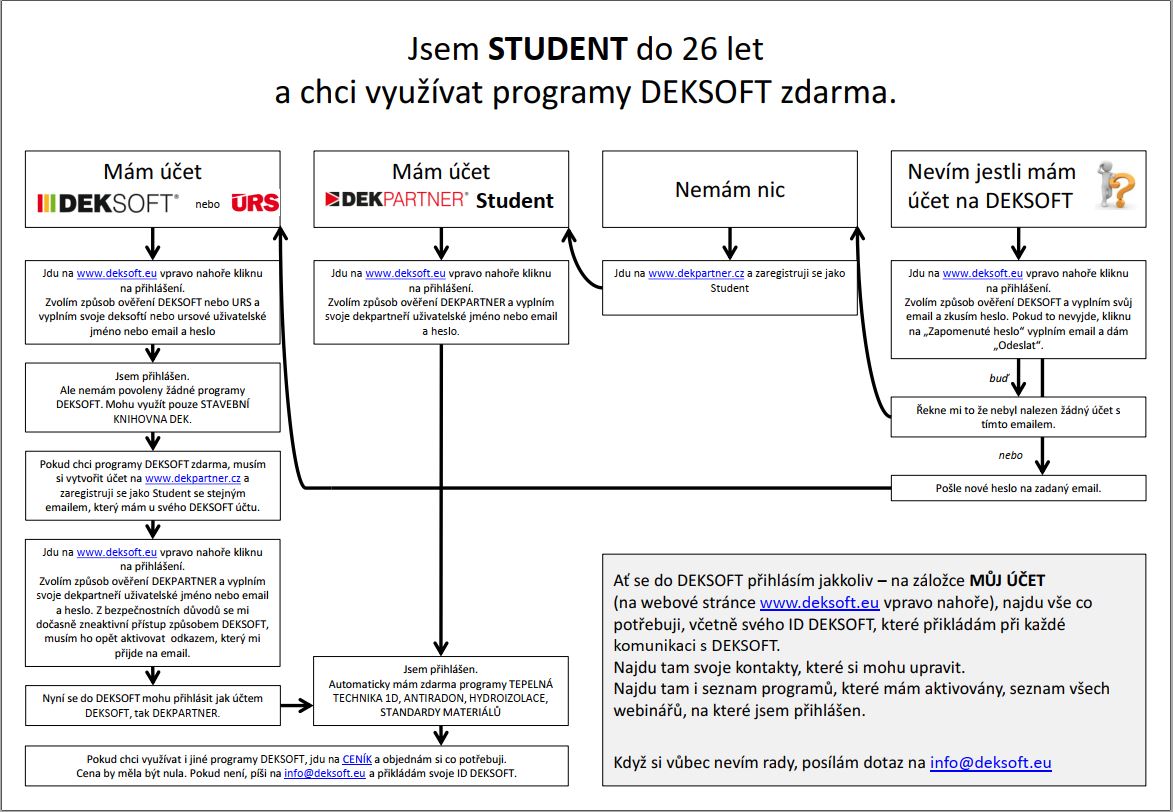 Pro plné využití výhod, které poskytuje registrace do programu DEKPARTNER je nutné mít propojen účet Dekpartner s účty jednotlivých společností DEK, jejichž aplikace a programy budu využívat. Do těchto účtů (ÚRS, DEKSOFT apod.) je třeba se pak připojovat vždy identitou Dekpartner. Pro zjednodušení správného postupu při registraci, přihlašování či řešení potíží jsme připravili podrobné návody v závislosti na typu účtu Dekpartner (projektant, student, učitel):
