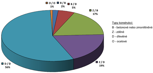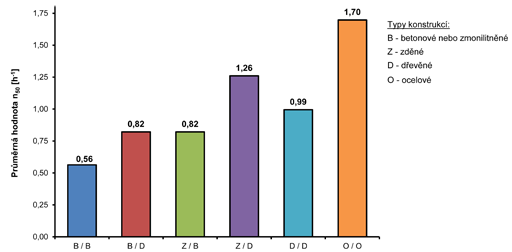 Nejnižších hodnot n50 bylo dosaženo u objektů s kombinací obvodové stěny i střechy (stropu) provedenými z monolitického betonu nebo ze zmonolitněných konstrukcí. Naopak nejhorších výsledků bylo dosaženo u objektů s ocelovou nosnou konstrukcí. Těchto objektů bylo měřeno poměrně malé množství a jednalo se spíše o atypické konstrukce. S výrazným náskokem byla druhá nejhorší kombinace s obvodovou stěnou zděnou a střechou dřevěnou. Takových objektů je naopak v souboru dat poměrně hodně, takřka pětina.