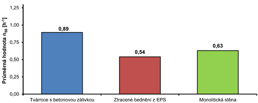 Hlavní vzduchotěsnicí vrstvu těchto konstrukcí tvoří samotná stěna nebo vnitřní omítka. Průměrné hodnoty celkové průvzdušnosti obálky budov pro uvedené typy obvodových stěn jsou v grafu na obr. 15, na kterém je patrné, že nejnižší hodnoty jsou dosahovány u objektů se ztraceným bedněním z EPS tvarovek.