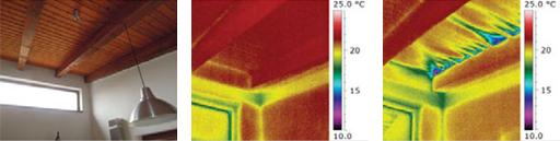 Rozdělení objektů podle vzduchotěsnicí vrstvy střechy s dřevěnou nosnou konstrukcí ukazuje, že nejlepších výsledků je dosaženo u budov se vzduchotěsnicí vrstvou střechy z desek na bázi dřeva, což jsou nejčastěji OSB desky. Typickou netěsností u střešních konstrukcí jsou nekvalitně provedené vzájemné spoje fólií, napojení na přilehlé konstrukce a napojení na prostupující konstrukce (příklad netěsného stropu podkroví je na obr. 16.