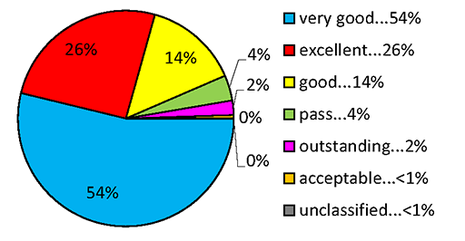 Podíváme-li se na procentuální zastoupení jednotlivých stupňů certifikace dosažených celosvětově u všech budov (obr. 4), pak na 1.místě je s 54% stupeň very good, na 2.místě s 26 % stupeň „excellent“, na 3.místě „good“ s 14 %. Dosažitelné stupně certifikace jsou uvedeny v tab. 5.