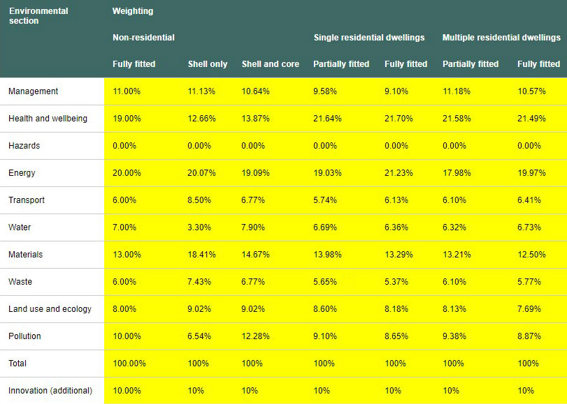 Významně se rozšířil počet bodů, které je možné v rámci certifikace získat, čímž je umožněna větší flexibilita v jejich výběru. Nadále zůstává zavedená metodika výpočtu výsledného skóre, přičemž počet dosažených bodů v jednotlivých oblastech je násoben tzv. váhou dané oblasti. Existuje 7 odlišných setů vah jednotlivých oblastí, a to pro 7 různých skupin objektů (tab. 7).