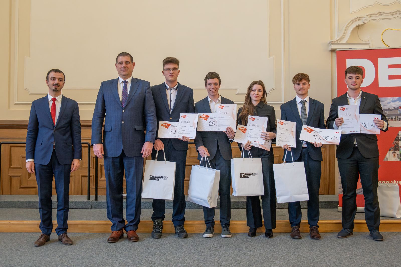 Právě těchto výše zmíněných deset vítězných projektů nejlépe naplnilo náročná kritéria a díky své vysoké úrovni si právem zasloužilo ocenění formou finanční odměny. Ta byla ve výši od 30 000 Kč (1. místa) do 10 000 Kč (5. místa). Finanční odměnu získali i vedoucí oceněných ročníkových projektů a to ve výši 10 000Kč. Jako uznání za skvěle odvedenou práci navíc každý z vítězů získává pro svou třídu exkurzi do výrobního závodu skupiny DEK. Jde o jedinečnou šanci zažít moderní stavební výrobu v praxi a získat náskok v odborném rozhledu.