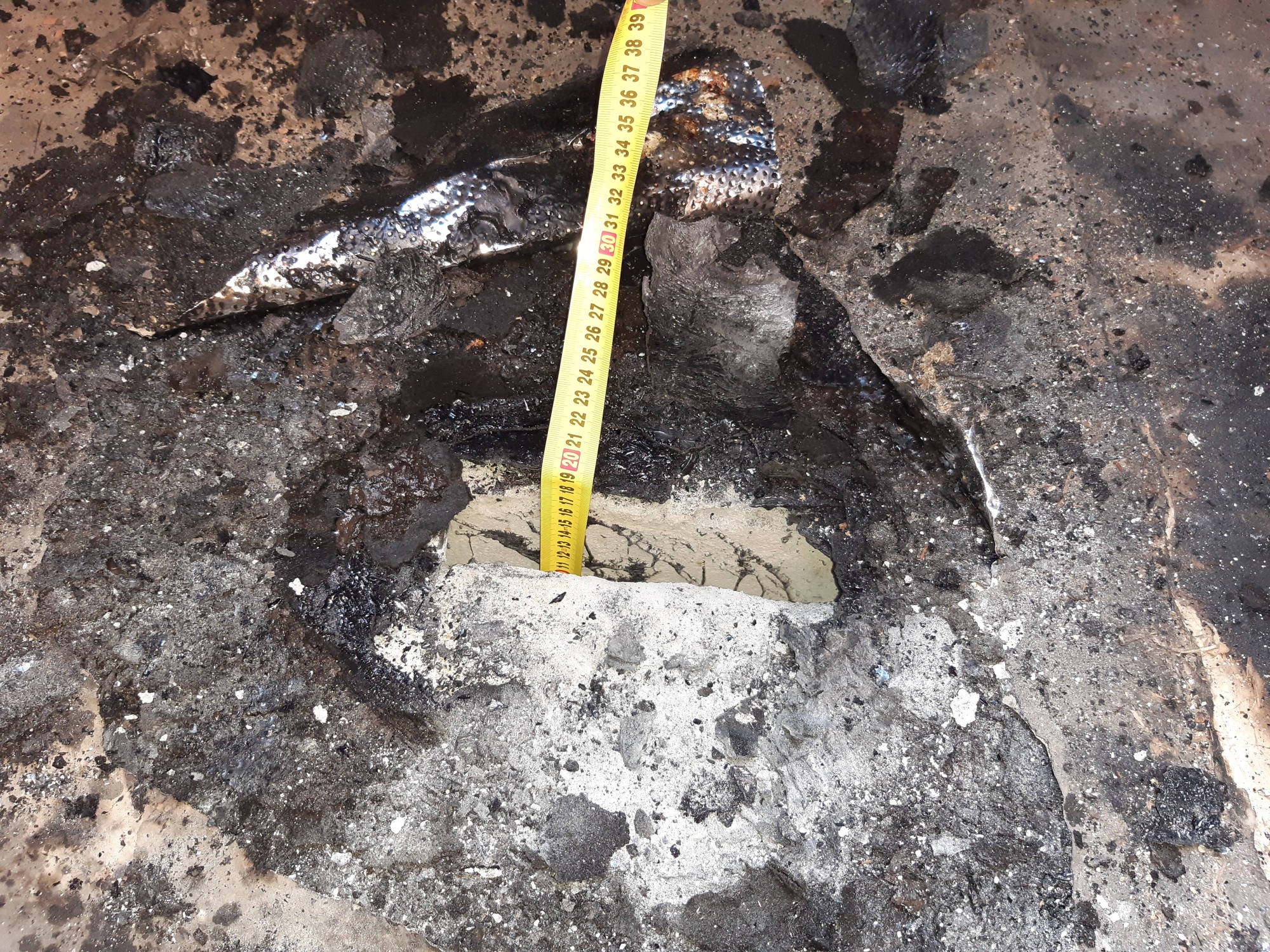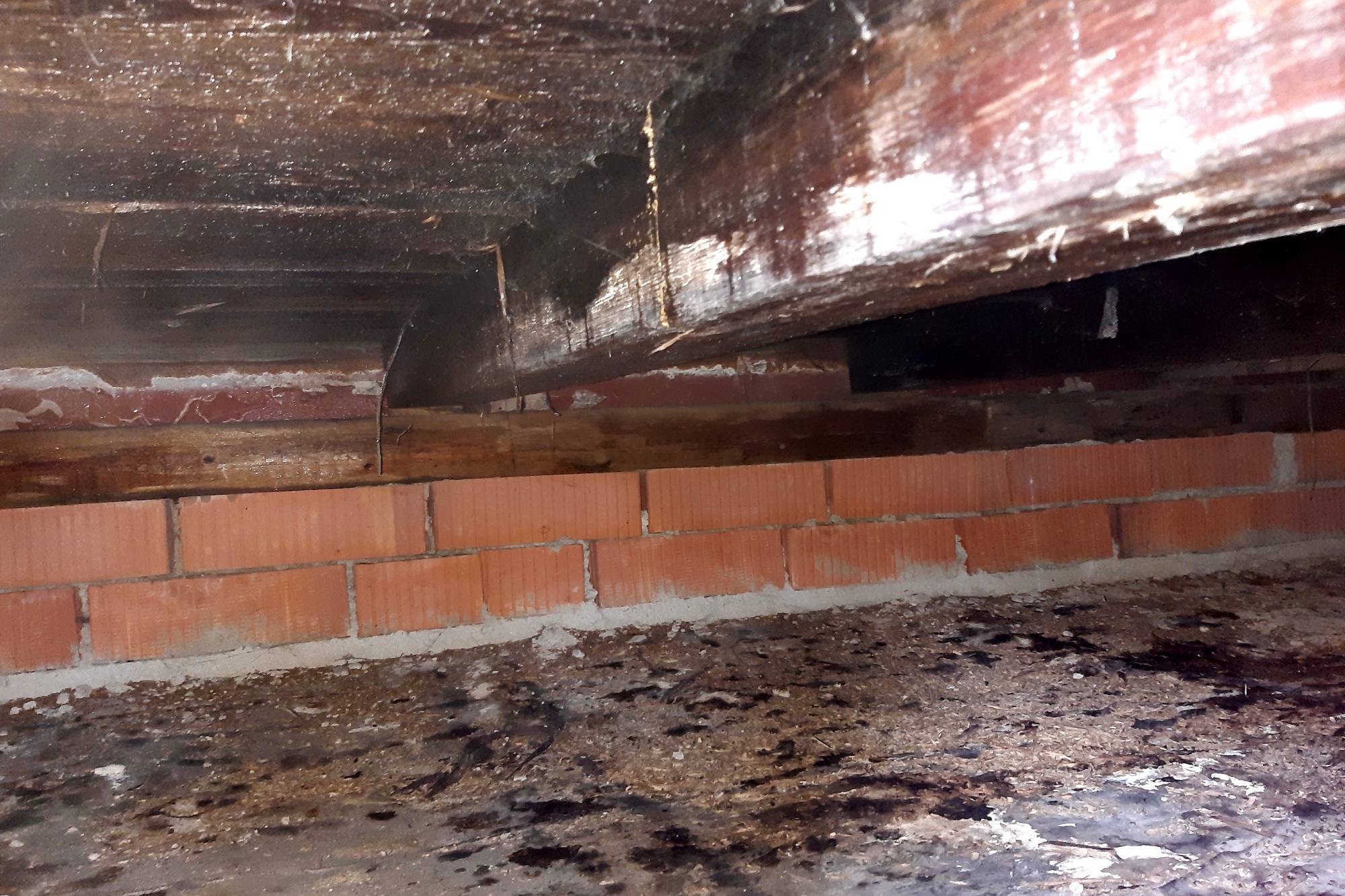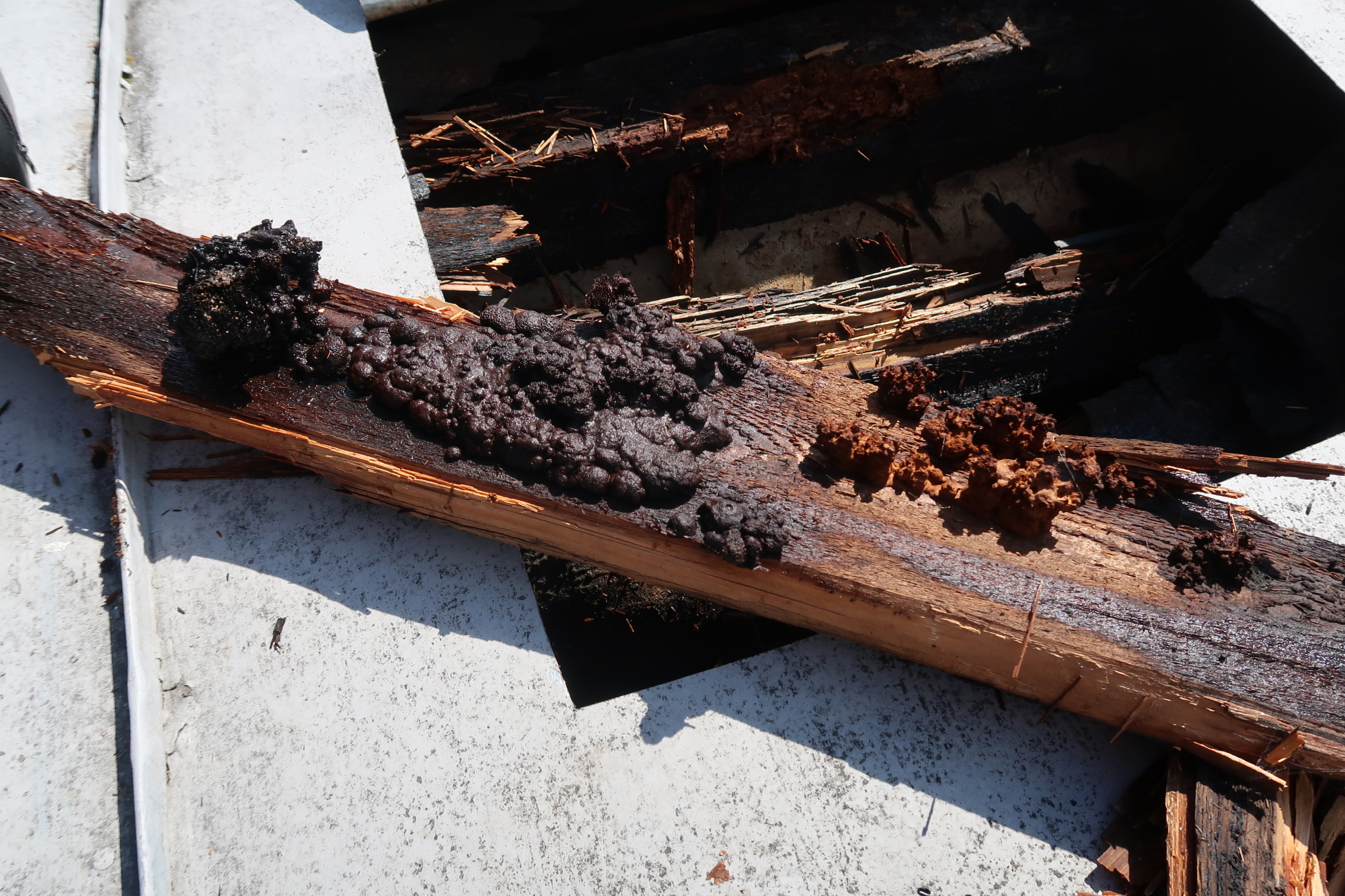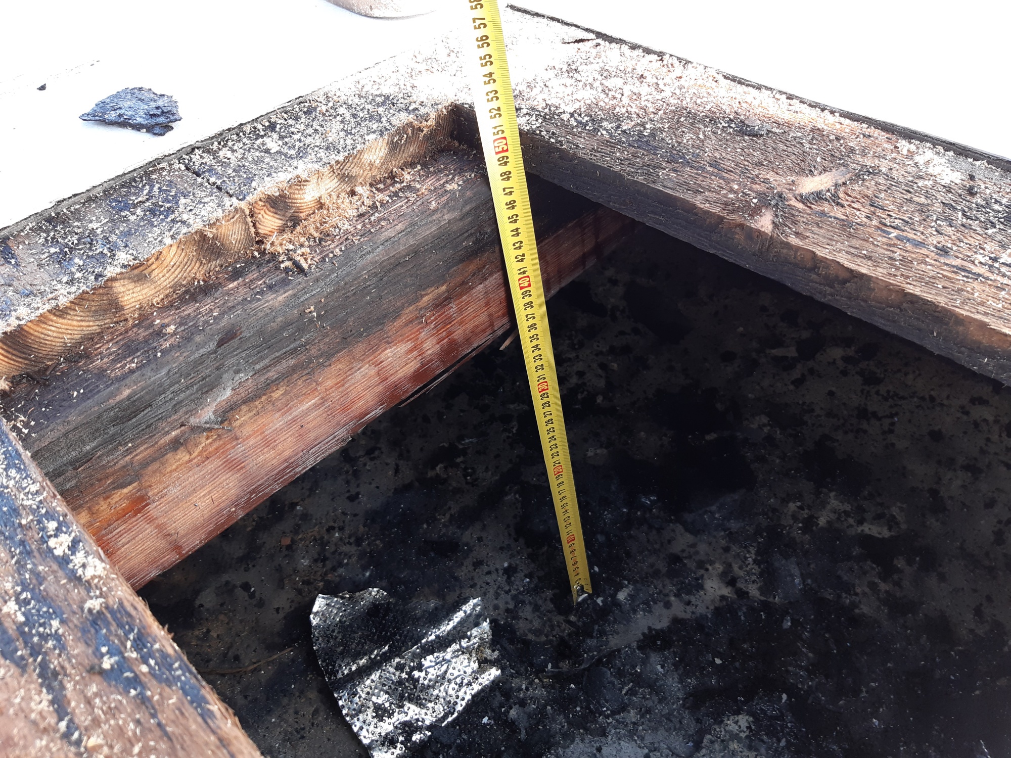 Sonda č. 1 – Pod krytinou a podkladním pásem se nacházelo bednění, které bylo mokré a jevilo známky začínajícího biologického napadení. Pod bedněním se nacházel rovněž mokrý a biologicky napadený krov. Na původním střešním plášti byly patrné stopy po úkapech vody.