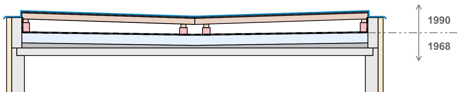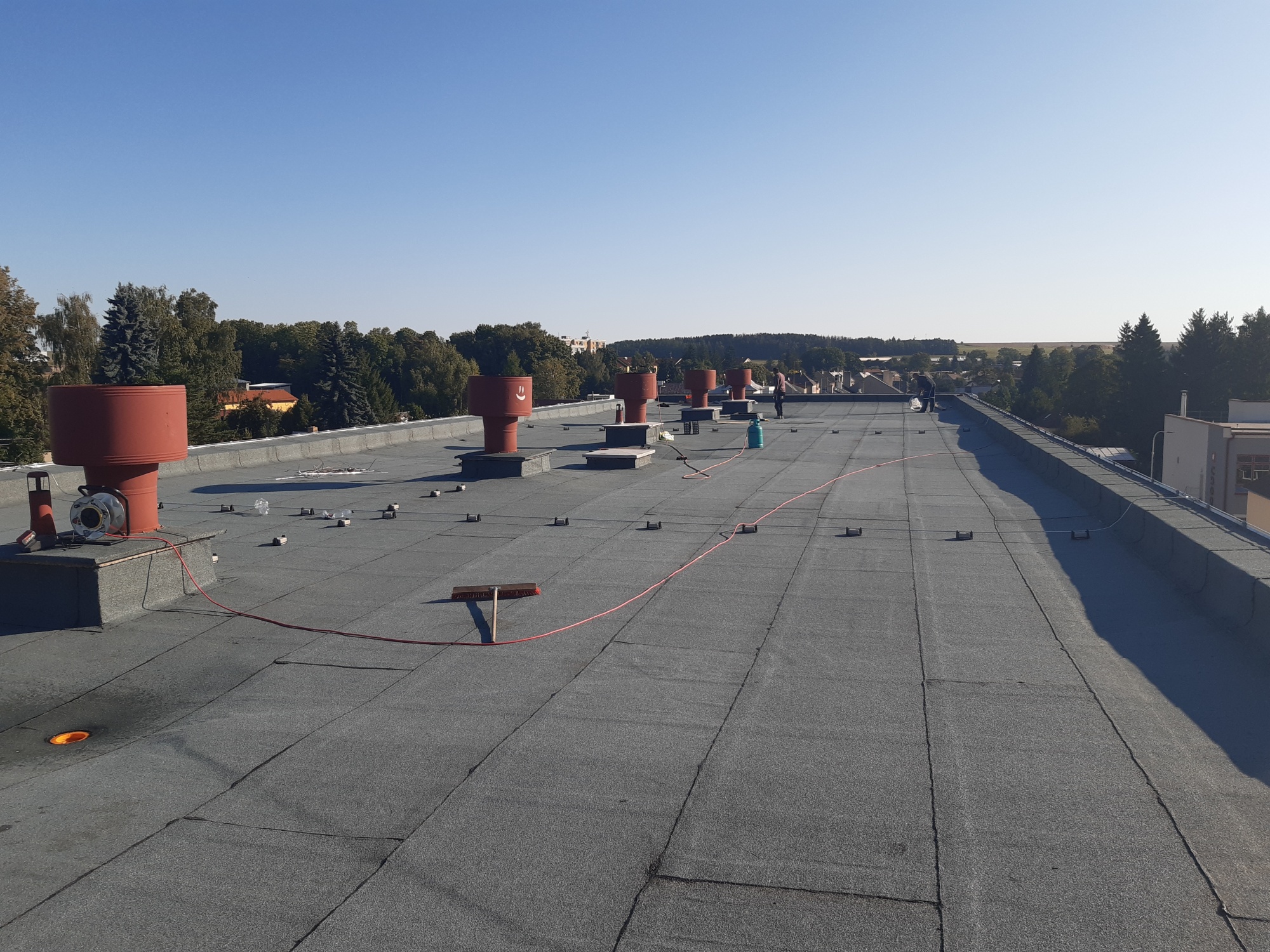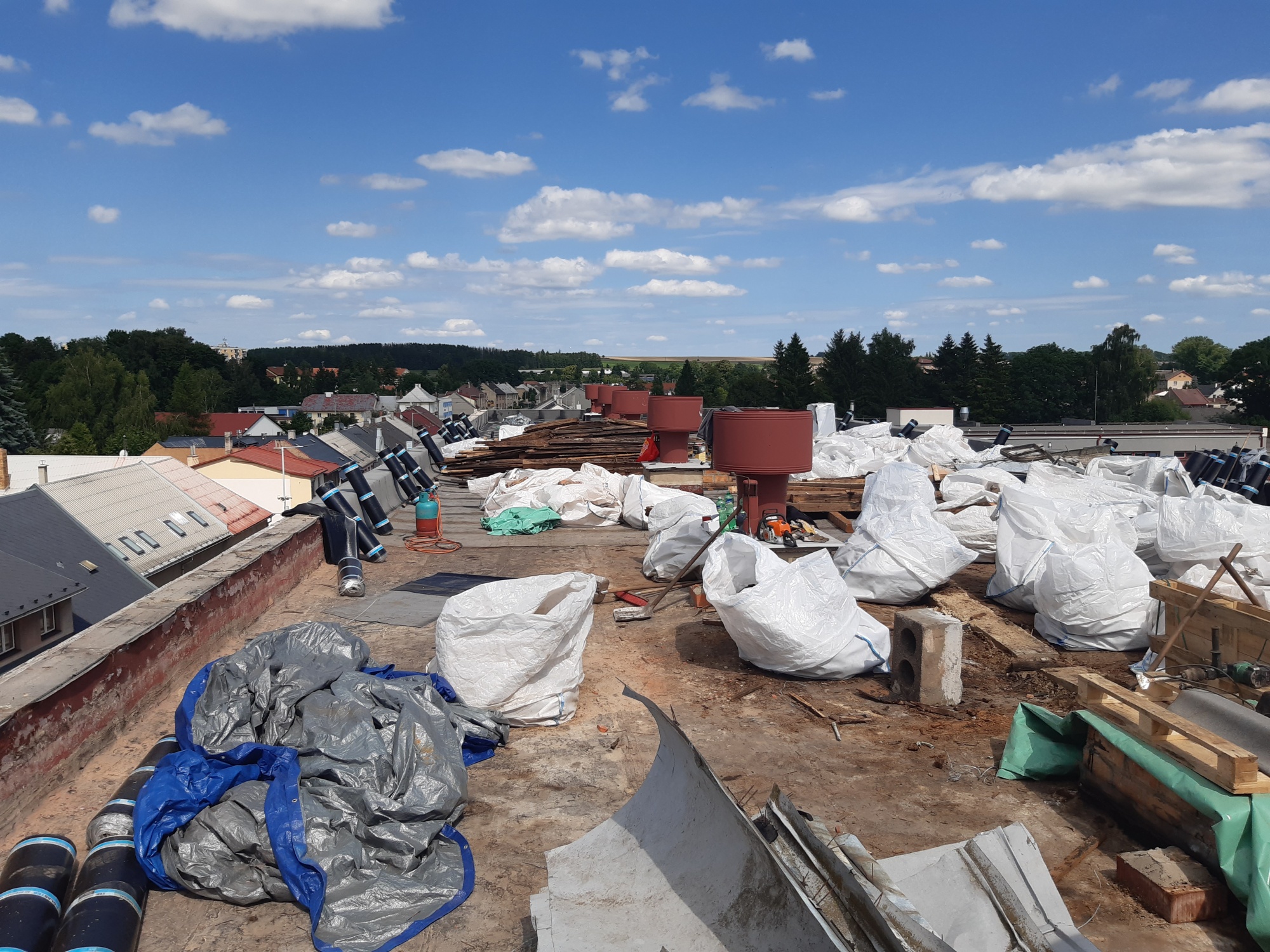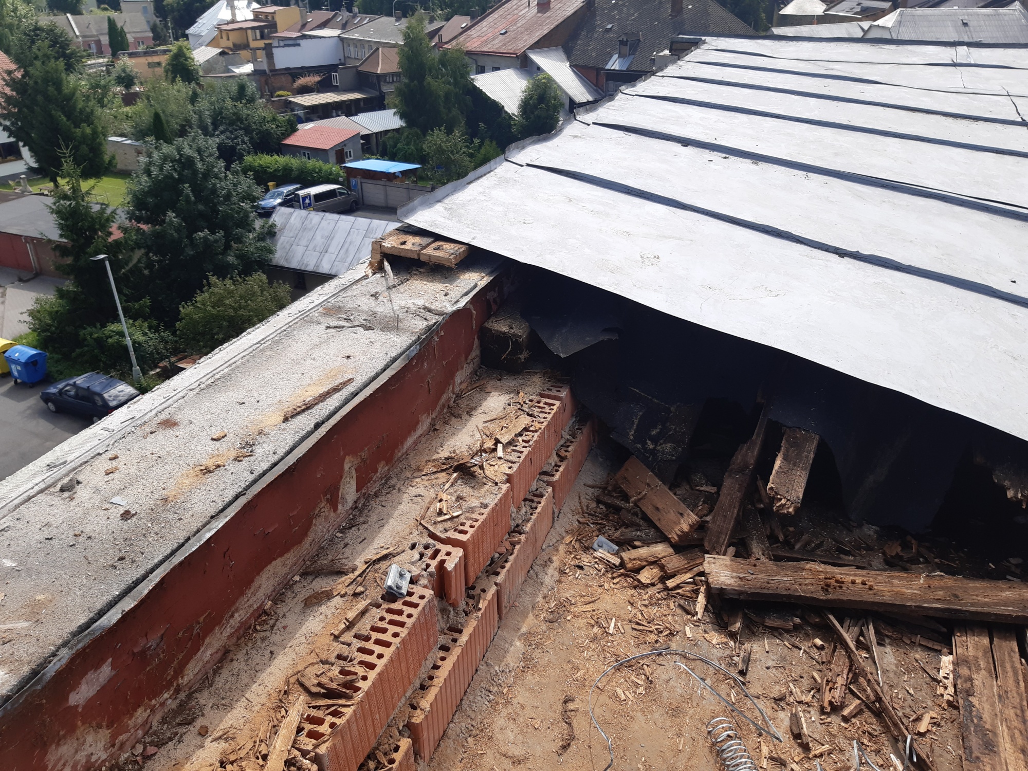 Na základě zjištěných poznatků jsme spolu s realizační firmou a investorem začali profilovat novou podobu rekonstrukce této střechy. Od začátku bylo jasné, že shnilý horní plášť musí vč. krytiny kompletně pryč. Myšlenka navrhnout zpět dřevěný horní plášť byla zavržena prakticky hned v zárodku a to zejména ze strachu z podobného osudu střechy, byť by byla snaha o návrh dostatečného větrání mezi oběma plášti. Zvítězil tedy návrat k jednoplášťové střešní konstrukci. Horní plášť dvouplášťové střechy byl vč. podezdívek kompletně demontován. Na původní hydroizolační souvrství z oxidovaných asfaltových pásů z roku 1968 byl přivařen asfaltový pás GLASTEK 40 SPECIAL MINERAL včetně napojení na veškeré navazující a prostupující konstrukce. Vznikla tak parotěsnicí vrstva pro novou skladbu střechy. Všechny další vrstvy byly k původní skladbě lepeny. Tepelná izolace včetně spádových klínů z EPS byla k podkladu i vzájemně lepena střešním polyuretanovým lepidlem. Následovalo nové hydroizolační souvrství ze samolepicího asfaltového pásu a vrchního natavitelného pásu s břidličným posypem.