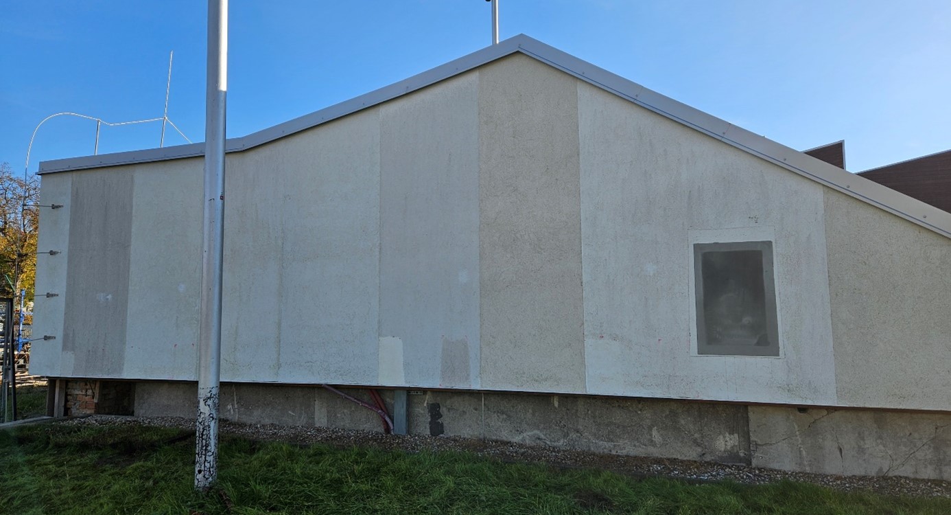 Na fasádách objektu jsou osazeny vzorky omítek pro ETICS různých výrobců, barev a technologií.