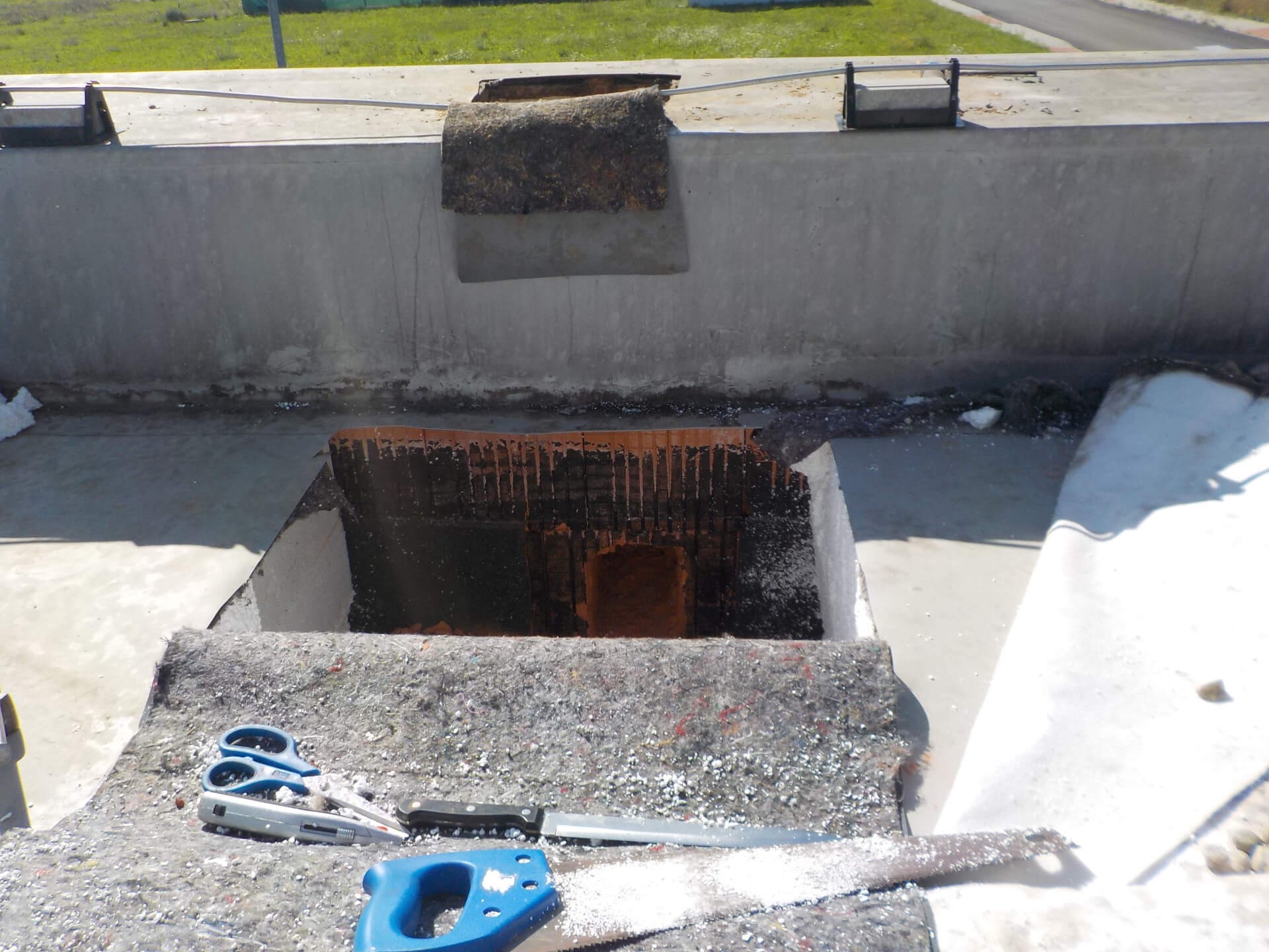 Je zřejmé, že k havárii koruny atiky došlo vlivem působení větru. Z fotografií 2 a 3 je patrné, že nedošlo k vytržení šroubů z železobetonového podkladu, ale k protažení hlav šroubů skrz degradovanou hmotu desek.
