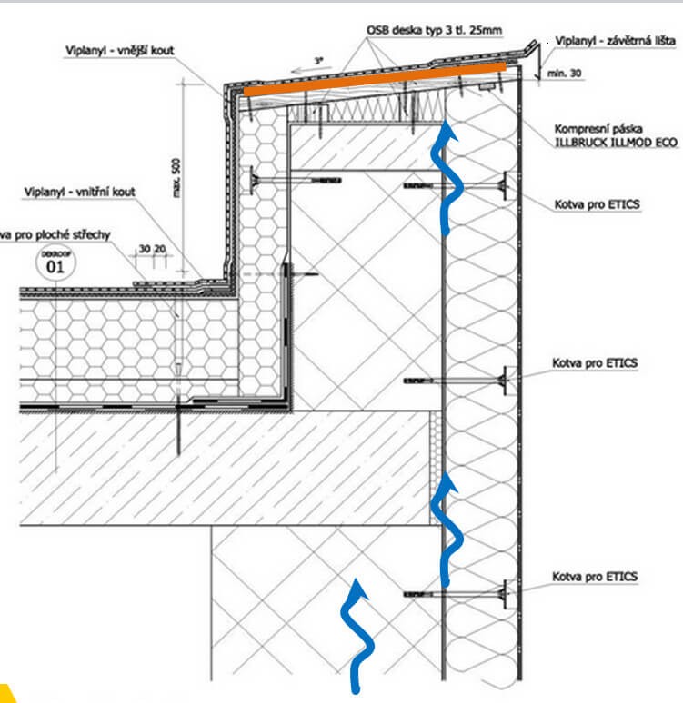 V devadesátých letech minulého století se na českém trhu začal objevovat nový materiál pod označením OSB (Oriented Strand Board - desky z orientovaných plochých třísek). Jedná se o desky z dřeva pojeného pryskyřicemi. Velmi rychle jsme přivykli pohodlí, které OSB desky snadnou opracovatelností, možností volby téměř libovolných formátů i únosností pro vruty nabízejí při tvorbě konstrukčních detailů. V několika případech jsme se ale setkali s destrukcí desek použitých v detailu atiky. Díky sdílení poznatků mezi našimi konzultačními techniky pohybujícími se denně na stavbách a techniky, kteří se zabývají vývojem konstrukcí, jsme identifikovali příčinu poruch a na základě získaných poznatků upravili i některé naše typové konstrukční detaily.
