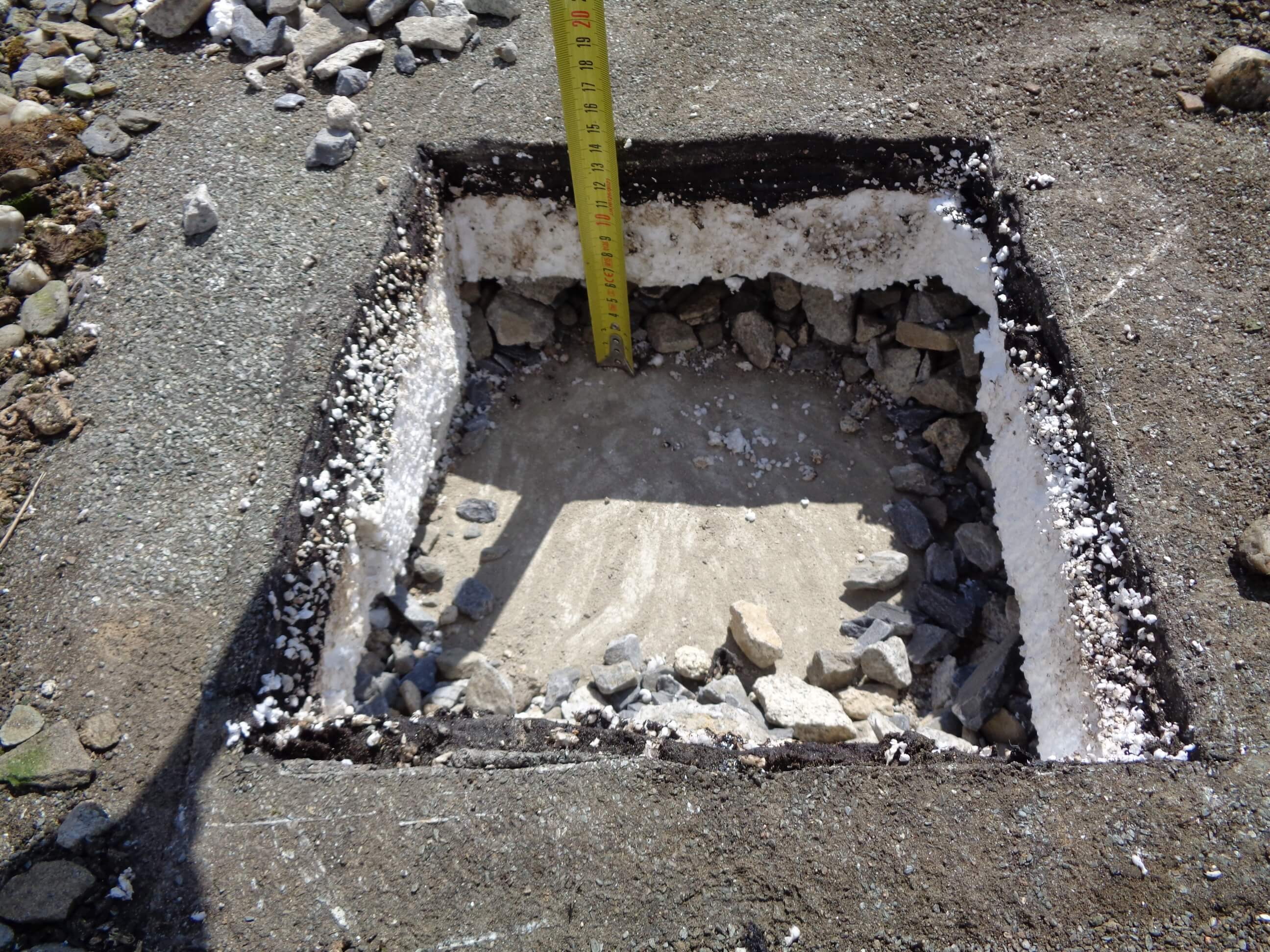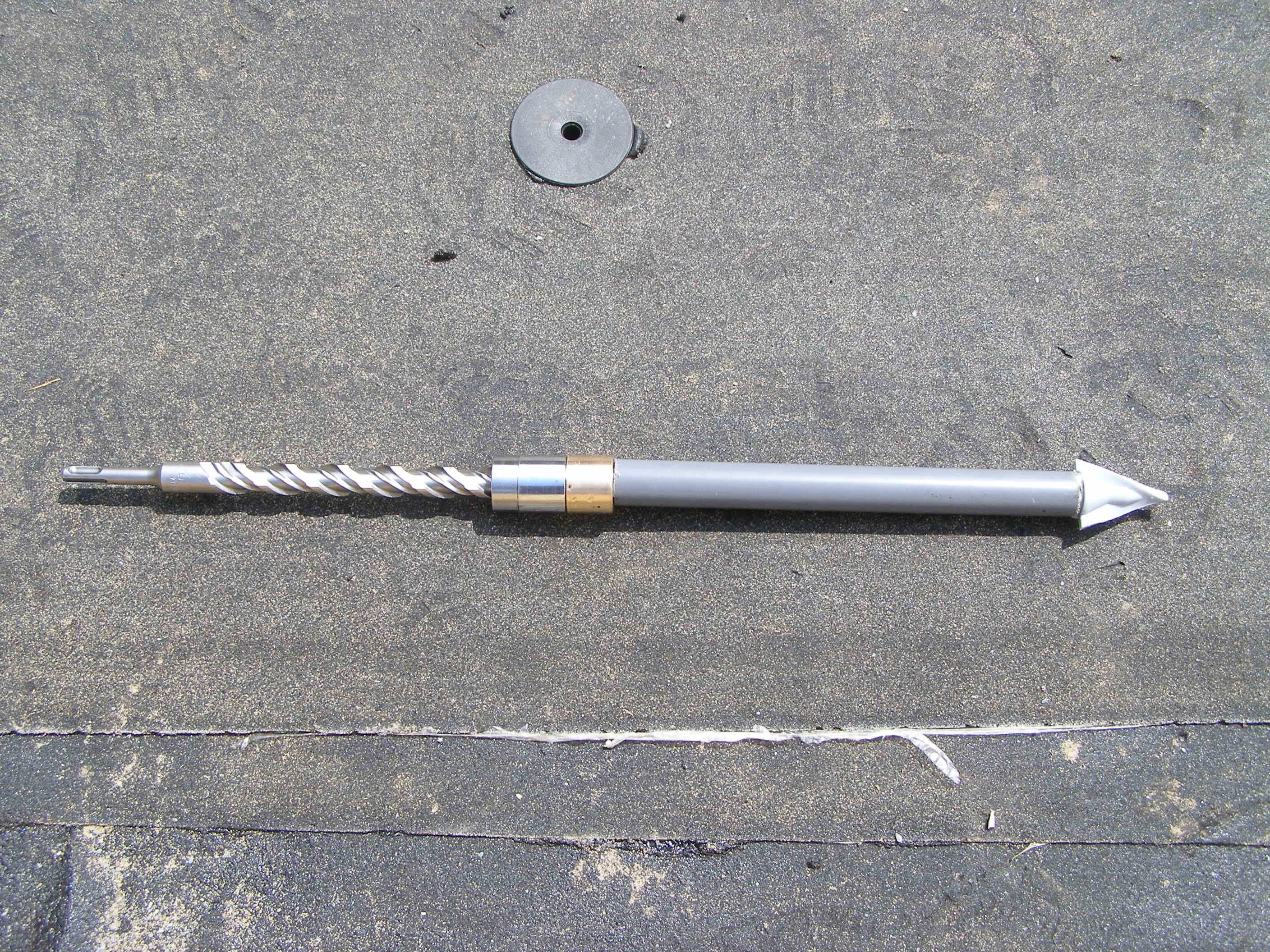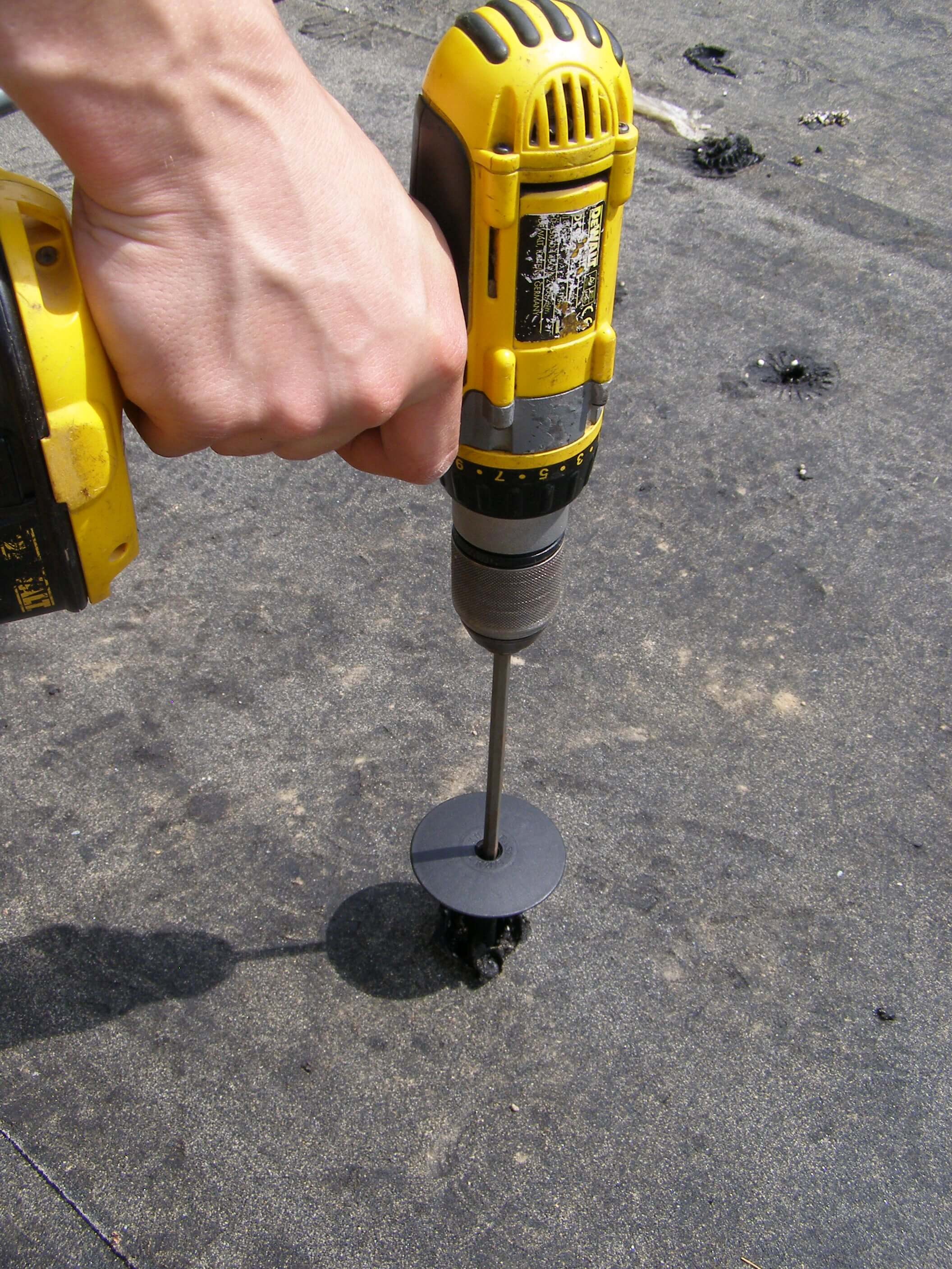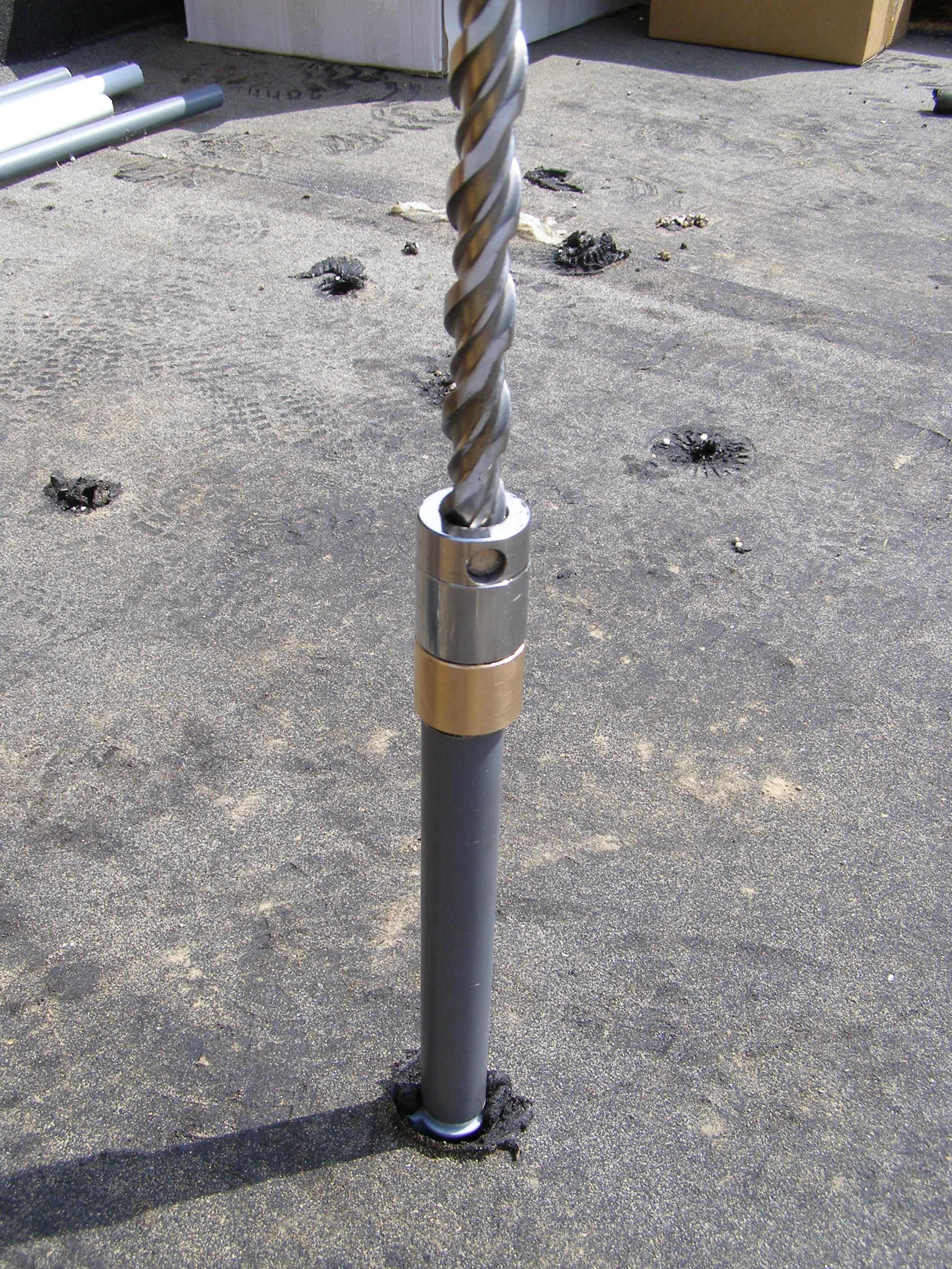 Princip technického řešení Vrtací soupravy DEK (viz obr. 13) spočívá v zavrtání trubkové chráničky do vrstvy násypu. Chránička zabrání zasypání předvrtaného otvoru a umožní tak přikotvení stávajícího asfaltového souvrství k podkladu standardní technologií za pomoci šroubu do betonu s plastovým teleskopem. Přikotvením stávající krytiny z asfaltových pásů získáme stabilní podklad pro realizaci nových vrstev lepením (obr. 19). Před realizací nových lepených vrstev je třeba ještě přířezem asfaltového pásu zapravit hlavy kotev, aby původní asfaltové pásy mohly plnit v nové skladbě funkci parozábrany a nedošlo k zatečení do střešního pláště během realizace. Popis jednotlivých kroků mechanického kotvení starého souvrství je na obr. 14–18. Systém rekonstrukce střechy s využitím Vrtací soupravy DEK je navržen tak, aby se v co největší míře využila stará hydroizolace jako parozábrana a po dobu rekonstrukce se uplatnila její hydroizolační funkce. Proto se kotví pouze staré souvrství a nové se lepí, aby chráničky po zavaření záplat nad nimi neperforovaly původní hydroizolaci = budoucí parozábranu.