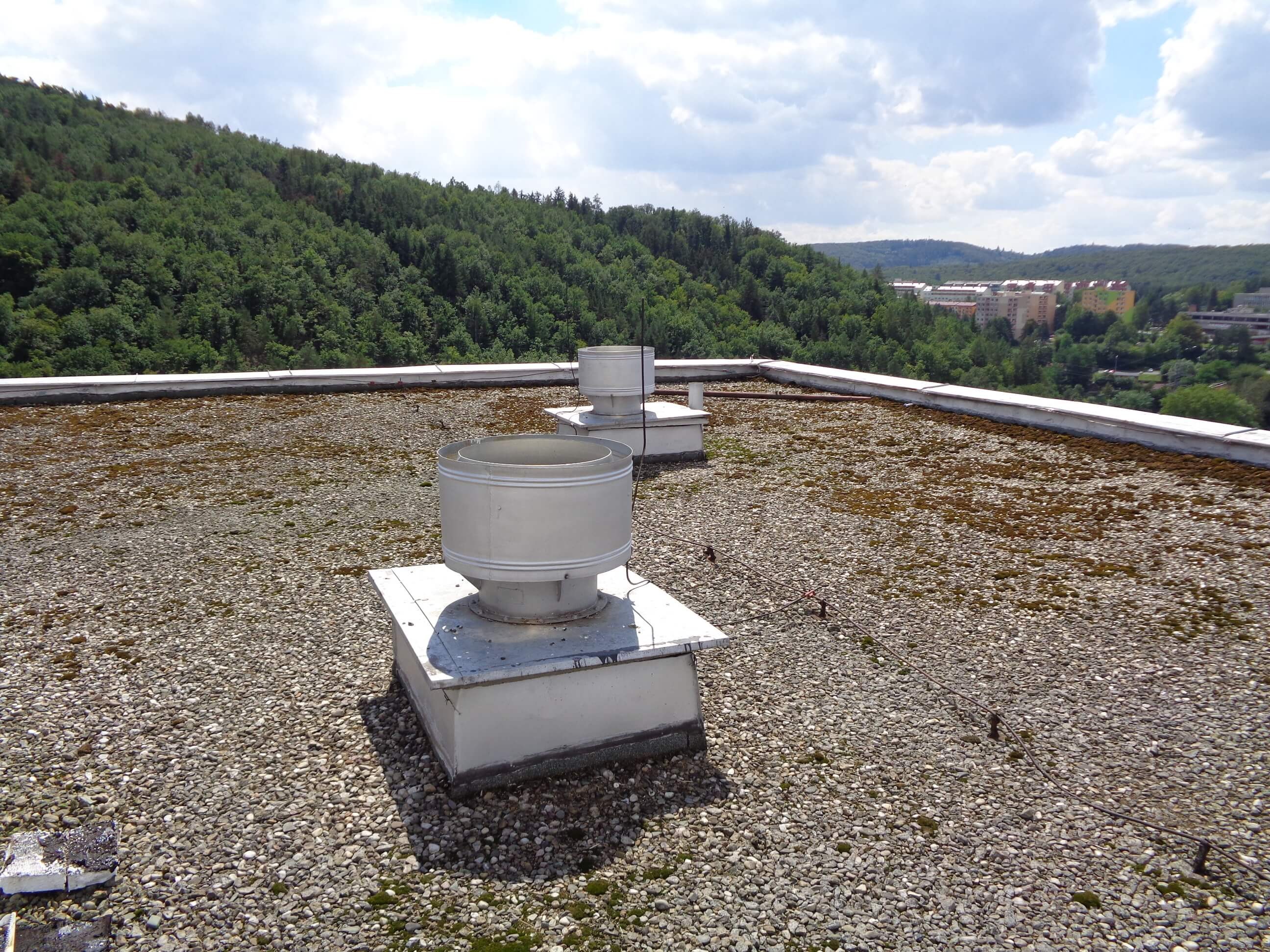 Stabilizace střechy zatížením (např. kamenivem, betonovou dlažbou)Při průzkumu střech objektů určených k rekonstrukci se často od pamětníků nebo z původní projektové dokumentace dozvídáme, že střecha původně byla stabilizována násypem kameniva, obvykle v tloušťkách okolo 5 cm. Stabilizační vrstva byla odstraněna ve chvíli, kdy bylo třeba provést opravu nefunkční hydroizolace. Z důvodu potřeby častých oprav nebo údržby hydroizolace již stabilizační vrstva nebyla na střechu navrácena. Proč tedy opět nenavrhnout stabilizaci zatížením? Dimenzi stabilizačních vrstev dnes stanovujeme na základě návrhového zatížení větrem dle ČSN EN 1991-1-4 (73 0035) – Zatížení konstrukcí – Část 1-4: Obecná zatížení – Zatížení větrem [3]. Po provedení výpočtu dle zmíněného předpisu projektant obvykle dojde k závěru, že potřebná hmotnost stabilizační vrstvy z kameniva nebo betonových dlaždic z pohledu sání větru není slučitelná s únosností stávajících nosných konstrukcí, výškou atik nebo neochotou dopravit mnoho tun materiálu na střechu.