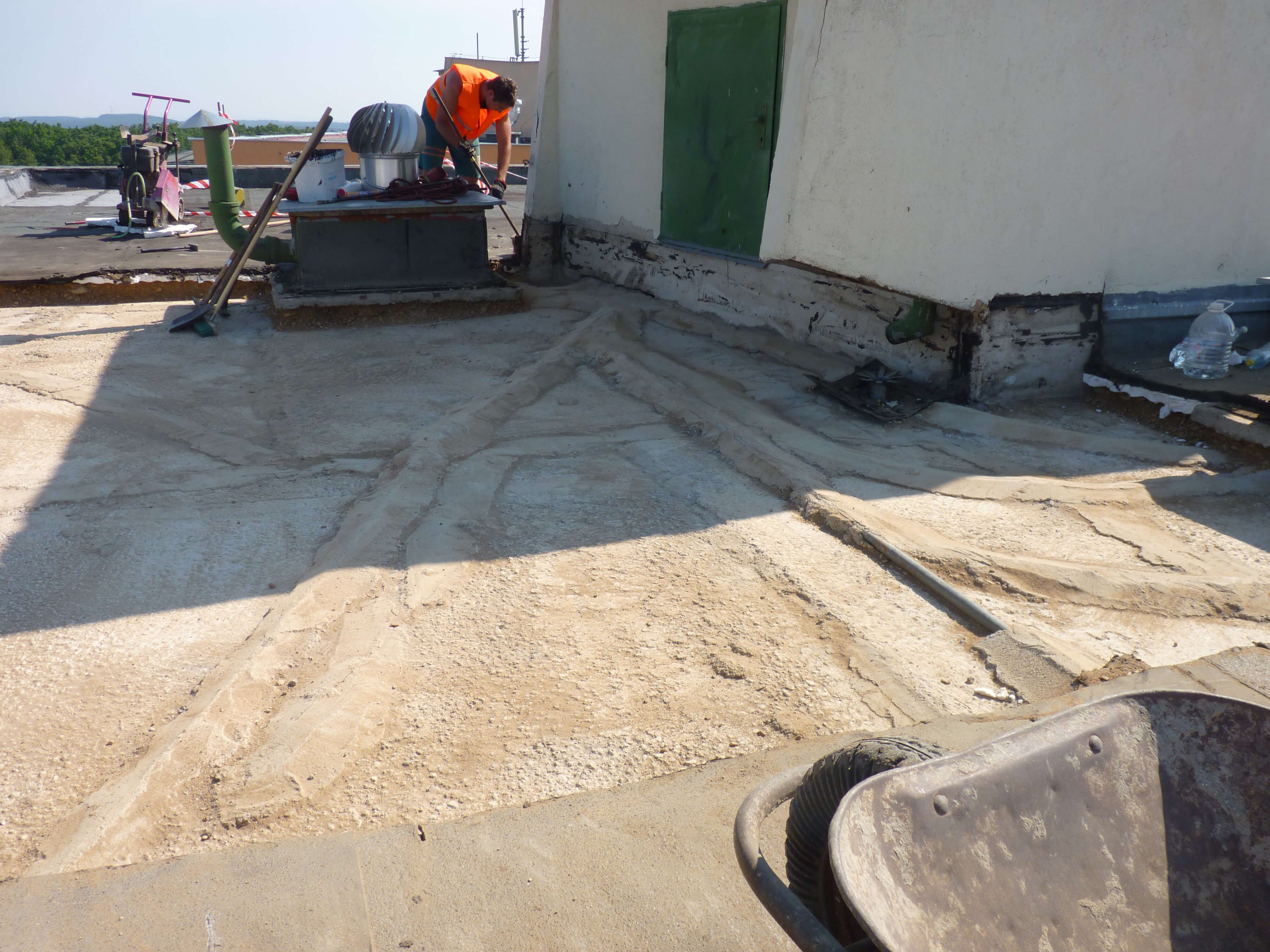 Odstranění starých vrstev střechy až na nosnou konstrukci a stabilizace nových vrstev přitížením, kotvením nebo lepením