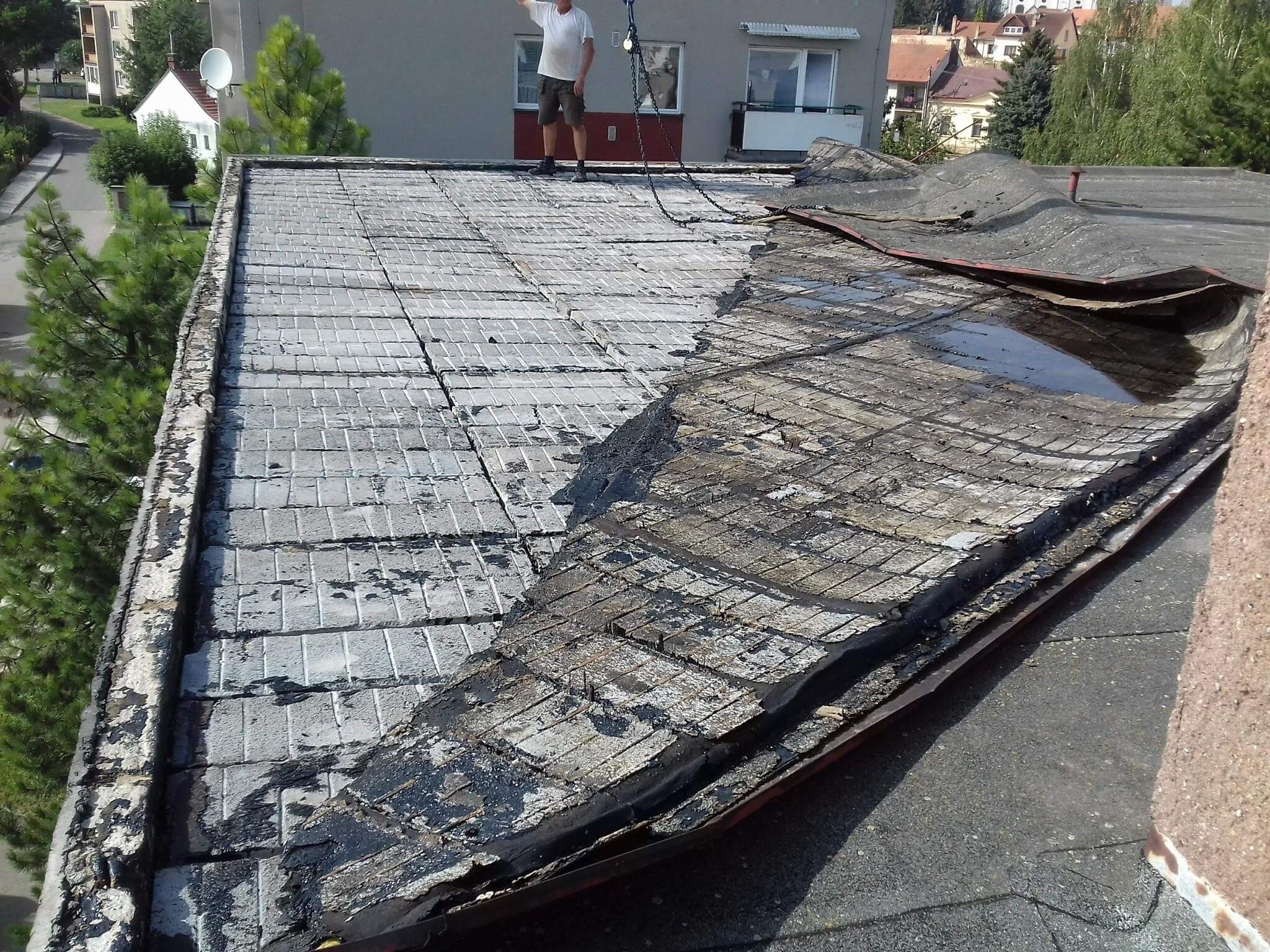 Pracovníci izolatérské firmy by určitě potvrdili, že souvrství hydroizolačních pásů je subjektivně poměrně tuhou a hmotnou vrstvou. Vždyť nebyli schopni bez použití těžké techniky vrátit hydroizolační vrstvu na své původní místo. Přesto tato vrstva svou hmotností nebyla schopna odolat působení větru. A připomínám, že se jednalo pouze o čtyřpodlažní objekt.
