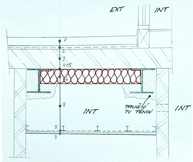 Plocha mezi ocelovými nosnými profily byla zateplena pěnosklem tl. 200 mm. Z úsporných důvodů investor rozhodl, že ocelové nosné profily a nepřístupná spára mezi nimi a příčkami se obalí a vyplní PUR pěnou.