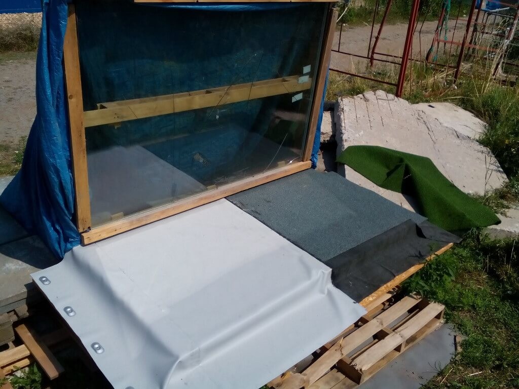 První den realizace byl postaven skelet modelu se základnou z dřevěných EURO palet a skeletovou konstrukcí stěny a zavětrování z dřevěných latí profilu 40x60 mm. Do připraveného modelu byla osazena bezrámová výplň s izolačním trojsklem o šířce 1 820 mm a výšce 1 280 mm s distančním rámečkem vysokým 10 mm. Pro zatížení modelu byly použity betonové dlaždice formátu 500x500x50 mm. Po osazení zasklení a zatížení modelu bylo provedeno vyrovnání stěnové konstrukce do svislé roviny. Stěnová konstrukce byla vytvořena tak, aby po osazení skladby modelové ploché střechy byla výška parapetu 60 mm.