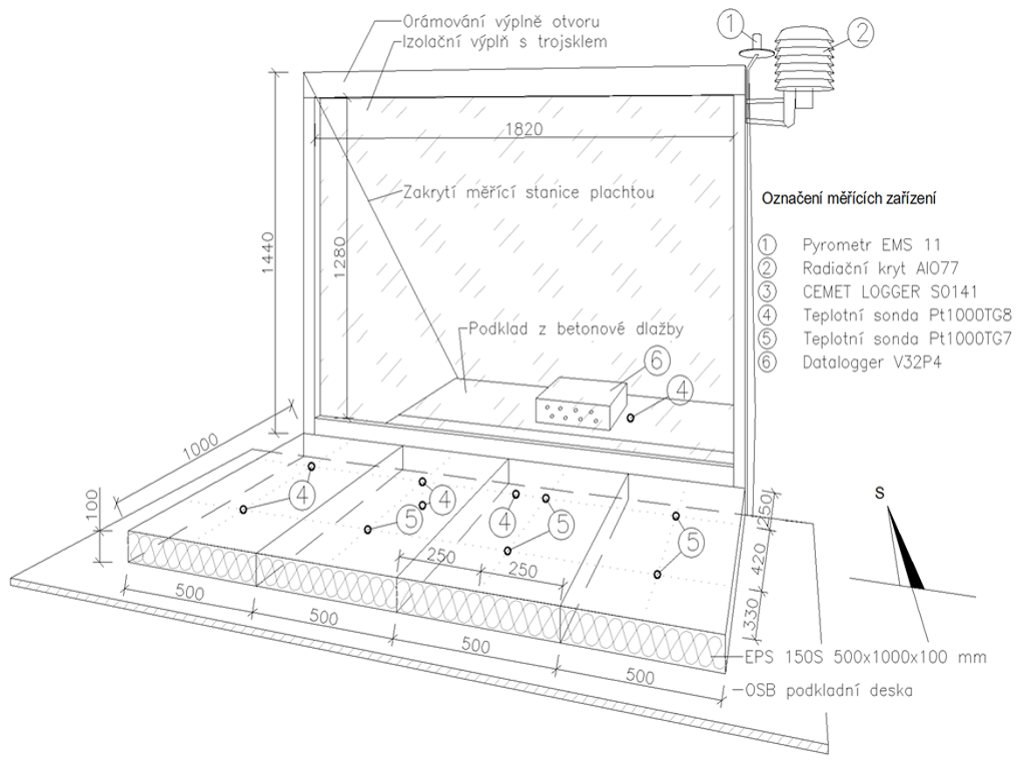Na experimentální model byly instalovány celkem čtyři typy měřicích senzorů. Prvním senzorem je pyrometr EMS 11 měřící intenzitu slunečního záření. Teplota vzduchu je měřena druhým senzorem, který je instalován do radiačního krytu AIO77. Na modelu se dále nalézaly odporové měřící sondy Pt1000TG7 pro určení povrchové teploty EPS a kontrolní teplotní senzory Pt1000TG8 měřící teplotu vzduchu na různých místech modelu. Tato měřicí zařízení byla napojena do datové schránky Datalogger V32P4. Analýza získaných dat byla prováděna pro hodnoty naměřené od 18. července.