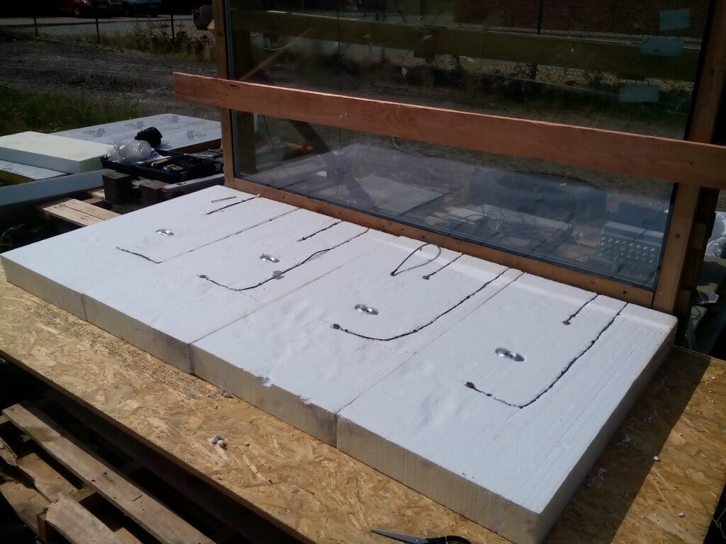 Na horním povrchu desek EPS byly vytvořeny drážky a prohlubně pro následnou instalaci měřicích zařízení. Pro kotvení izolačních desek byly použity dva kusy plochých ocelových podložek EJOT mechanicky kotvených do podkladní OSB desky. Následovalo umístění měřicích senzorů a jejich stabilizace.
