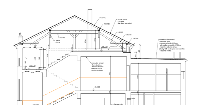 Při návrhu nástavby architekt využil konzultaci technika ATELIERU DEK. S podrobnějšími informacemi o využití systému DEKPANEL se do konzultace zapojil Ing. Uherka z divize DEKWOOD společnosti STAVEBNINY DEK. Na základě výkresové dokumentace (Obr. 2,3,4) Ing. Uherka následně navrhl rozdělení nosné konstrukce na jednotlivé panely a zpracoval výrobní dokumentaci. Označení použité ve výrobní dokumentaci se pro orientaci při montáži přenese ve výrobě na panely.