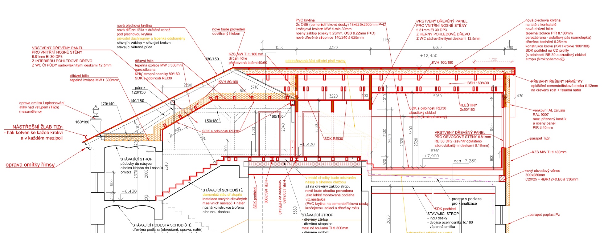 Na novém krovu se realizovala střešní skladba s nadrokevní izolací, obvodové stěny se zateplovaly kontaktním zateplovacím systémem z minerální vaty. Na nové i původní střeše se provedla krytina z lakovaného pozinkovaného plechu.