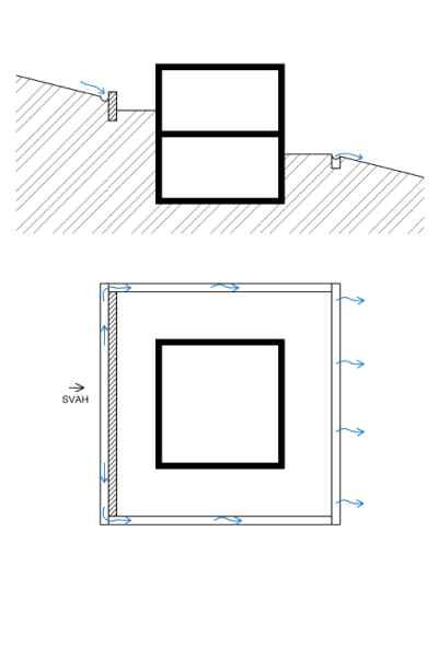 Plošný drén stěn je zaústěn do plošného drénu umístěného pod podlahou objektu, který je odvodněn mimo objekt. Plošnou drenáží pod podlahou bude systémově protékat voda tekoucí např. z výše umístěného svahu, viz Obr. 5.