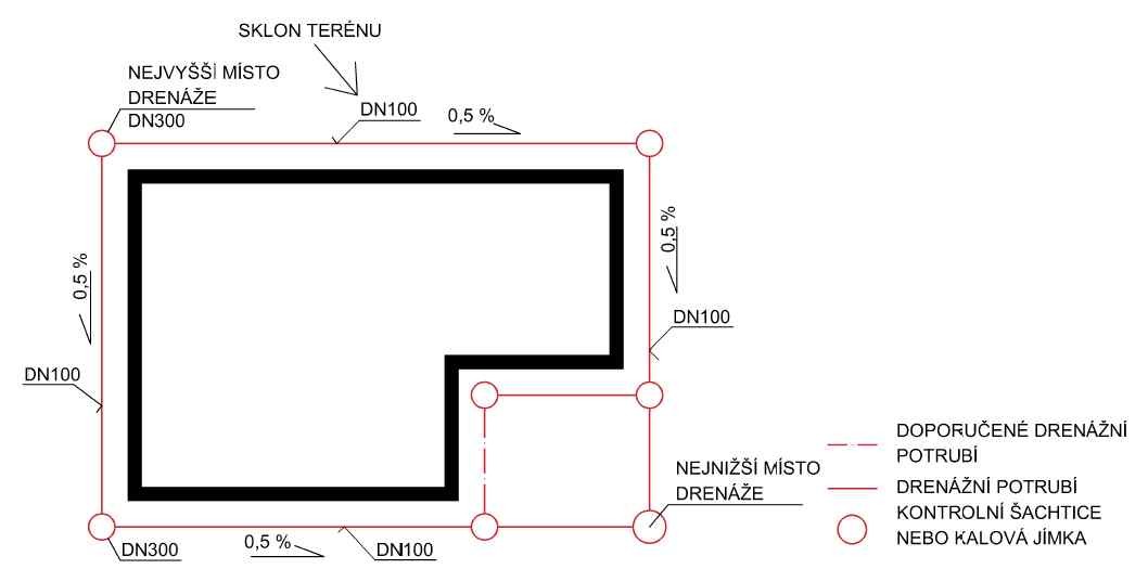 Plošná drenáž stěn je zaústěna do obvodového svodného liniového drénu. Obvodový svodný liniový drén je zónově napojen na potrubí vedoucí vodu mimo objekt. Tento způsob se uplatňuje především u větších staveb, kde by vycházela velká délka obvodového svodného liniového drénu. S nárůstem délky drénu se zvyšuje požadavek na jímací kapacitu drénu a zvyšuje se riziko zanášení. Hloubka uložení drénu je úměrná délce drénu, a tím může ovlivnit i potřebnou hloubku založení stavby. Schéma umístění drénů je na Obr. 4.