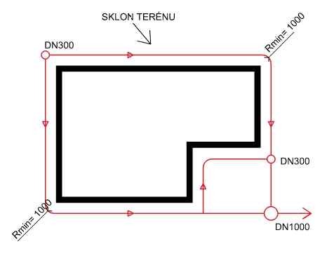 Čisticí a kontrolní šachtice není nutné osazovat, pokud drenážní potrubí v místě směru trasy (v rohu objektu) bude mít poloměr ohybu min 1 m a vzdálenost šachtic nepřesáhne 50 m, viz Obr. 23.