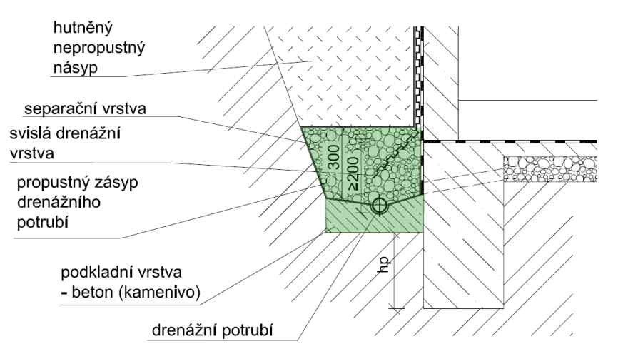 Obr. 18 Schéma paty obvodové drenáže s propustným podkladem (hydroizolace je zakreslena schematicky) [14]