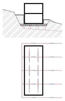 Obr. 5 Podtokem plošnými drény (nahoře řez, dole půdorys)