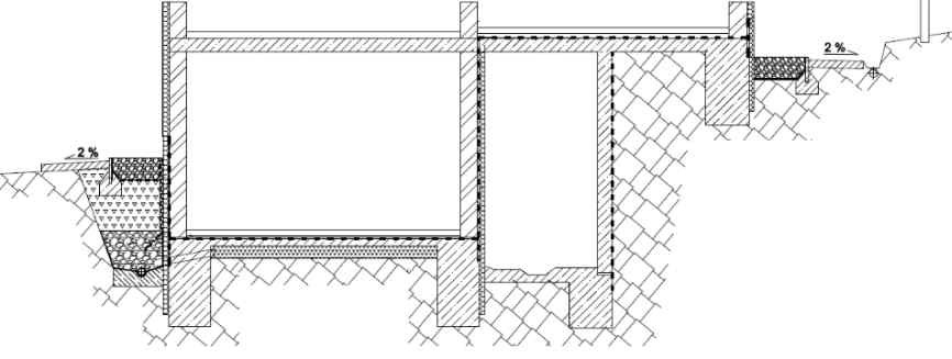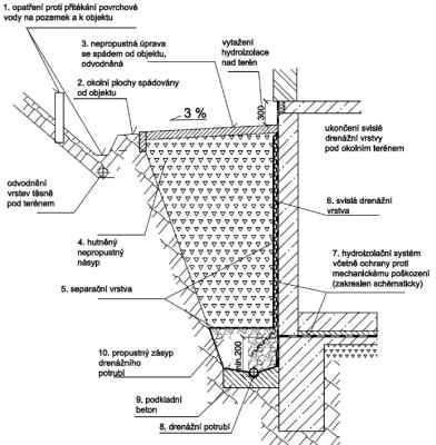 Plošná drenáž stěn a pod podlahou je zaústěna do obvodového svodného liniového drénu, kterým voda odtéká mimo objekt.