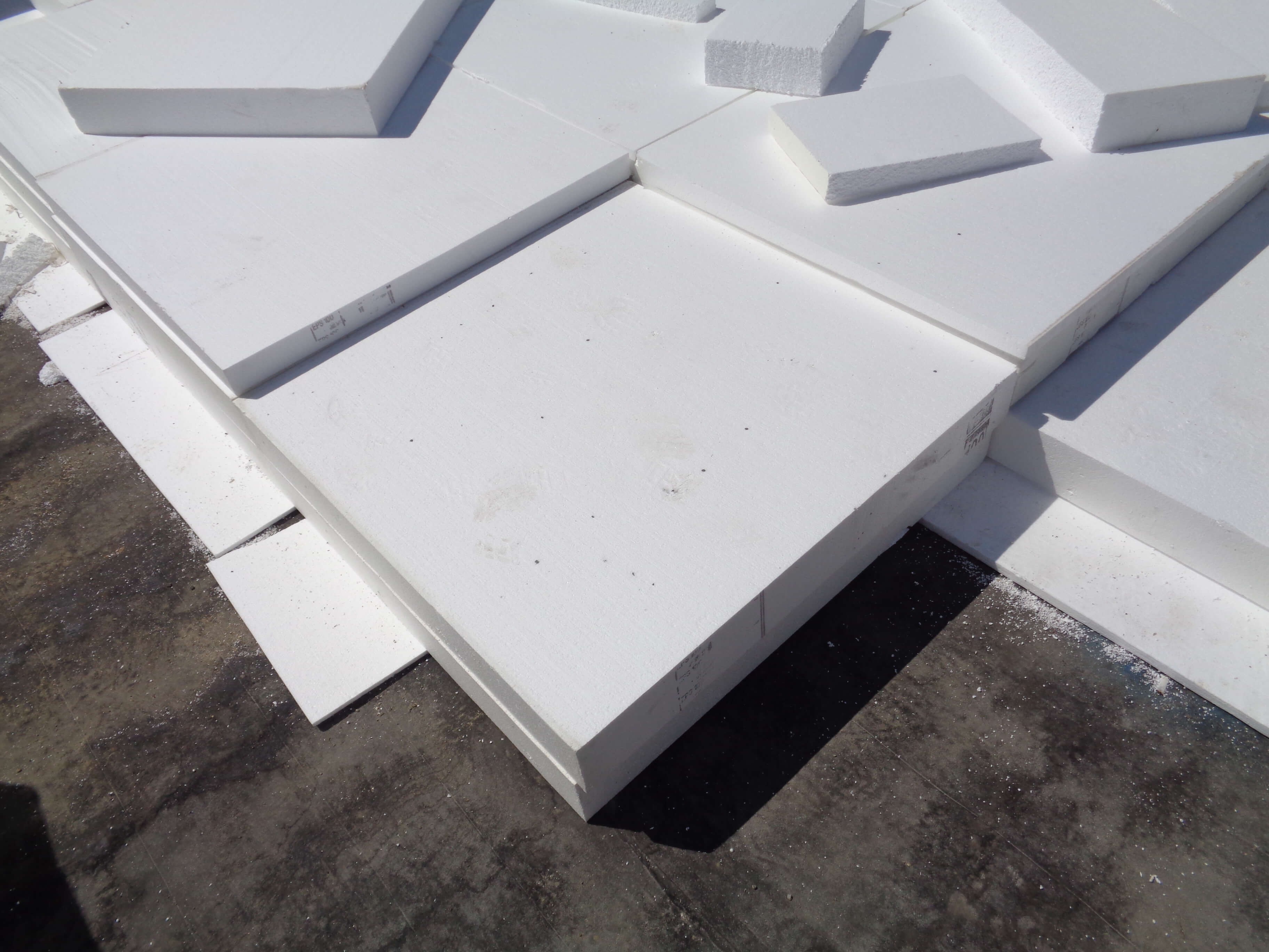 Bylo nutné provést vyrovnání podkladu – povrchu nosné konstrukce. Izolatéři se rozhodli pro podložení deskami EPS v různých tloušťkách (foto 9), tak aby bylo možné provést správné spádování střechy ke vtokům dle kladečského plánu. Spádová vrstva byla provedena z tepelné izolace EPS 100, ve spádu 3%. Spádové desky 1 x 1 m byly vyrobeny v tl. od 30 mm a podloženy rovnými deskami o tl. 120 a 240 mm. Na spádové desky se ještě pokládaly rovné desky EPS 100 o celkové tlloušťce 220 mm (foto 10).