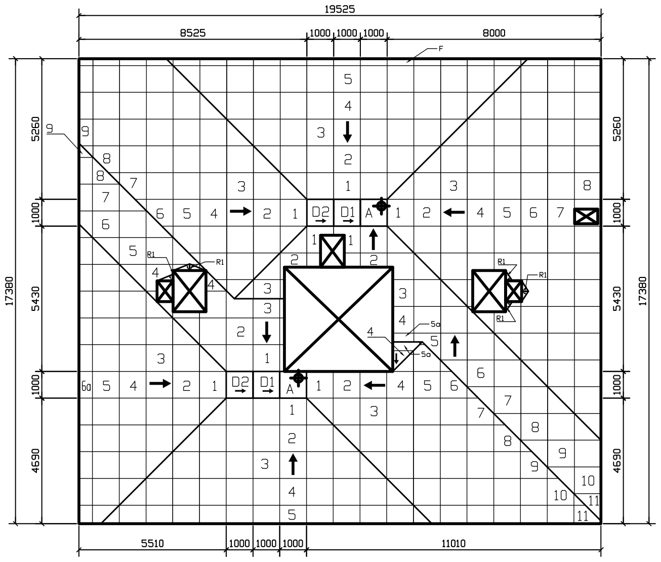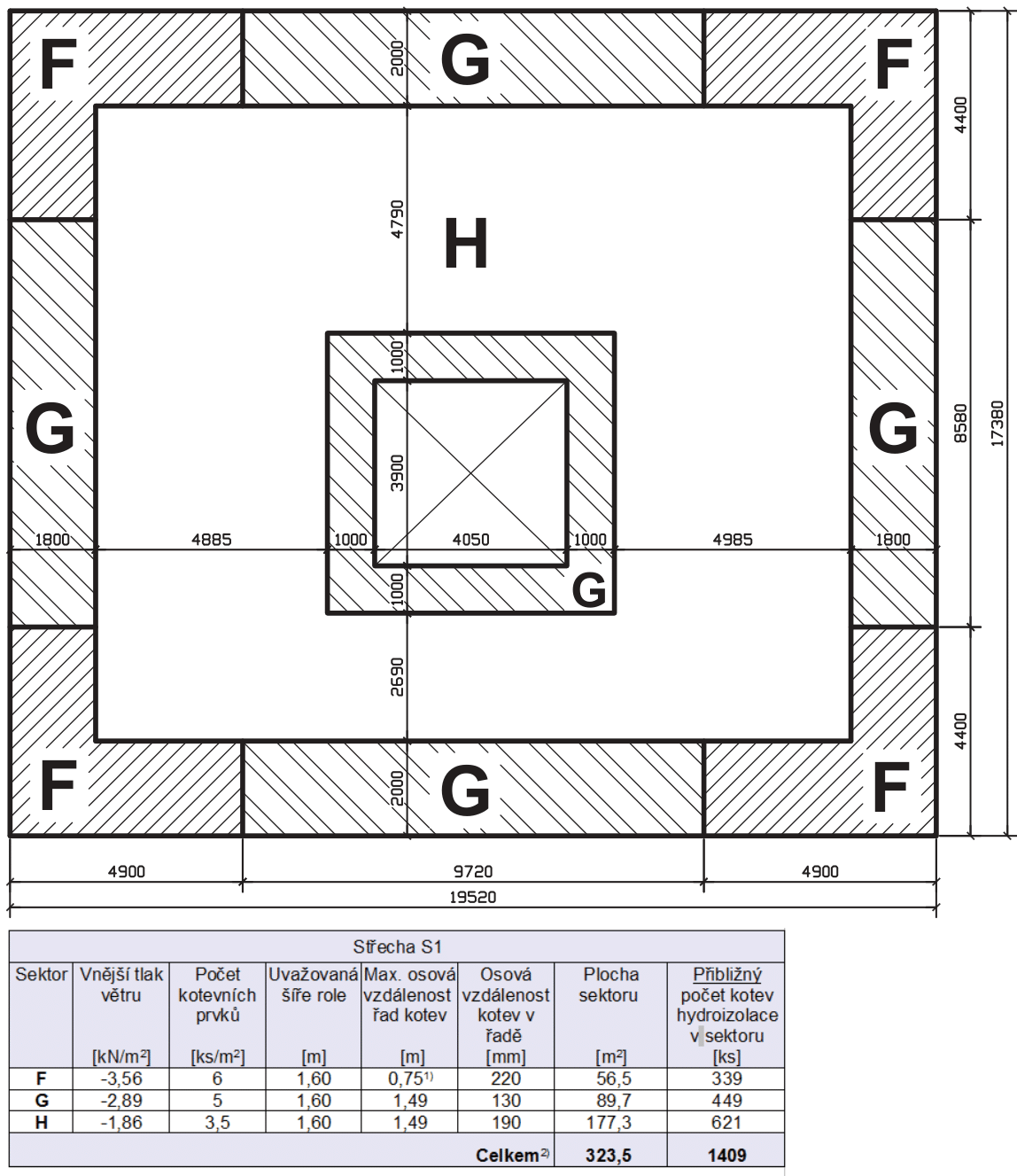 Pro střechu byl Konzultačními techniky Atelieru DEK vytvořen kotevní plán (obr. 1) pro stabilizaci zcela nových vrstev ploché střechy. Byl vyhotoven i kladečský plán spádových klínů (obr. 2) v tepelné izolaci, kde byl zvolen spád 3% (v souladu s normou ČSN 73 1901) - což se s ohledem na nerovnosti po odtěžení střechy ukázalo jako velmi dobrá volba.