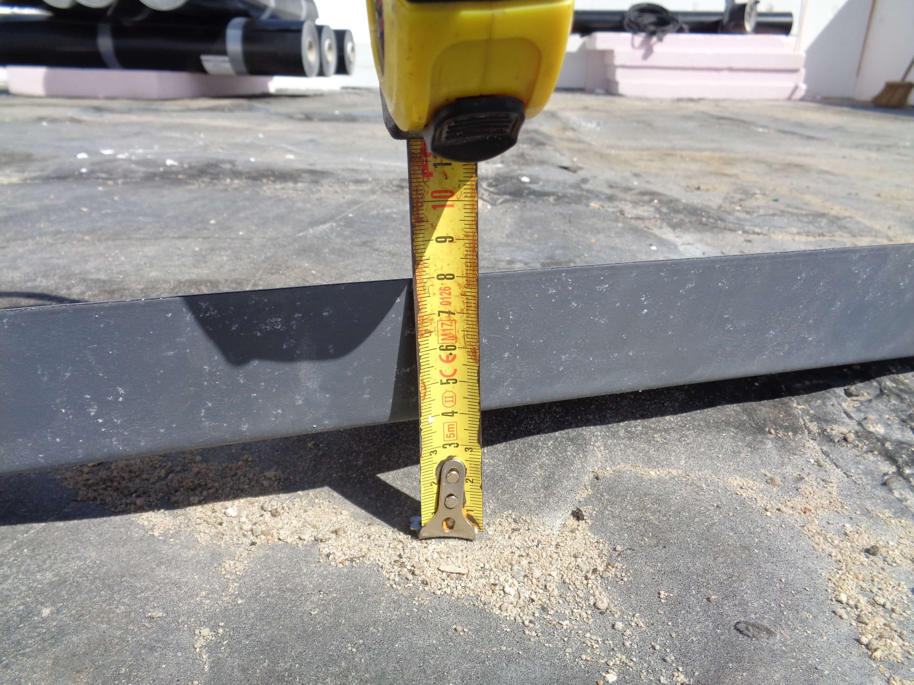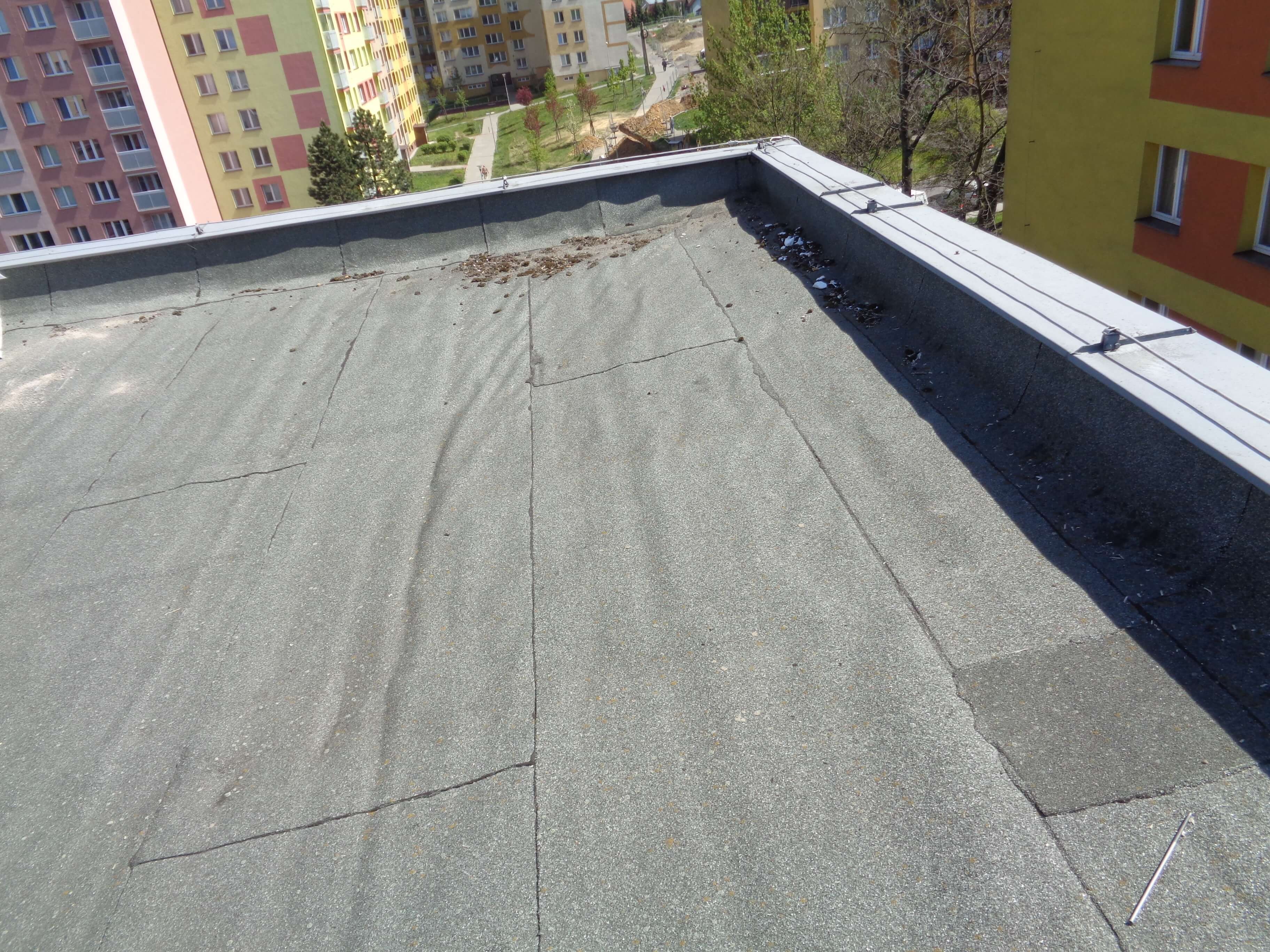 Stávající hydroizolační vrstva z asfaltových pásů byla zvlněná (foto 1), jak v ploše tak i na vnitřních svislých plochách atik. Takové zvlnění je známkou toho, že střešní souvrství není správně připevněno k podkladu a že se pohybuje.