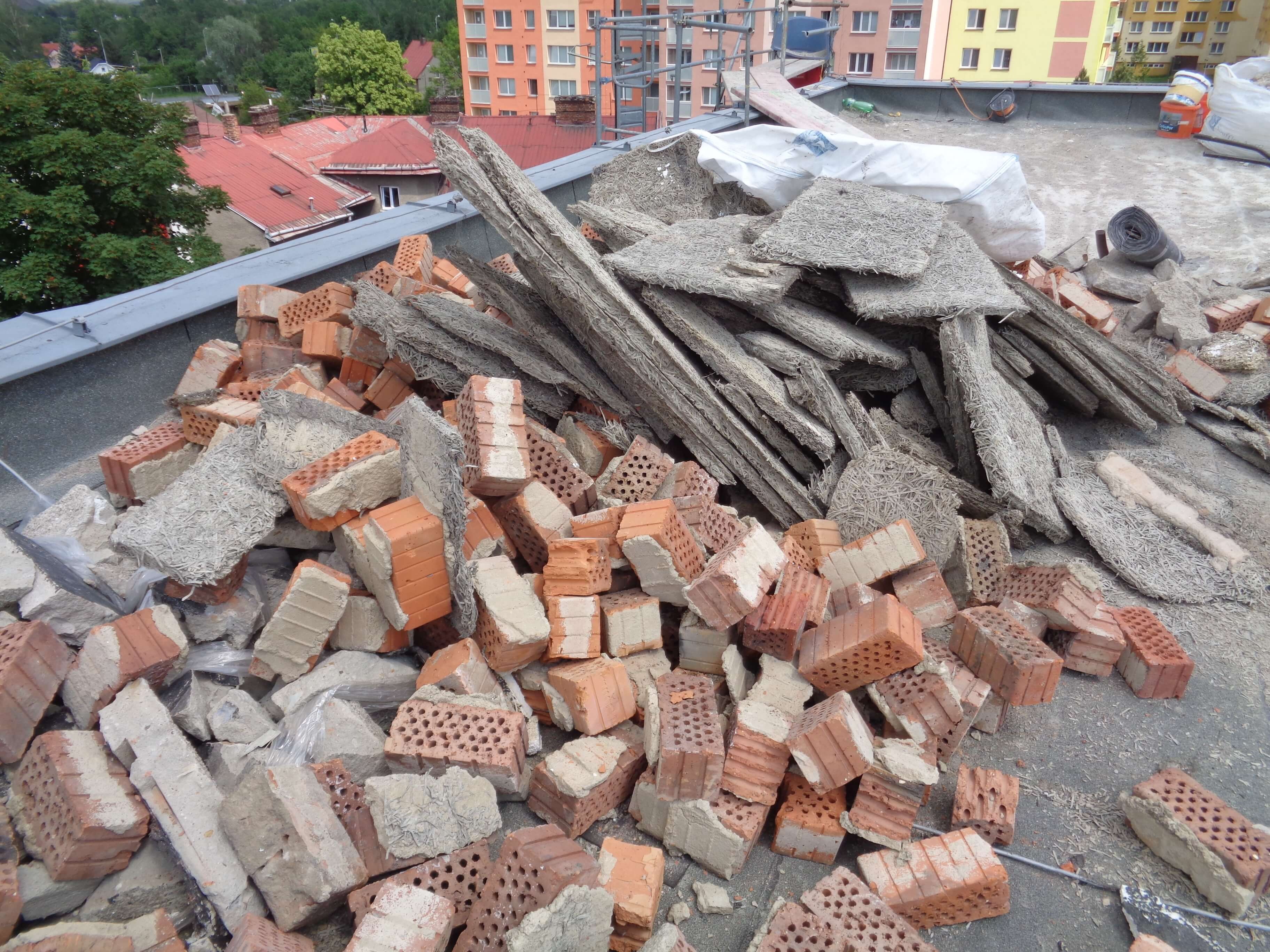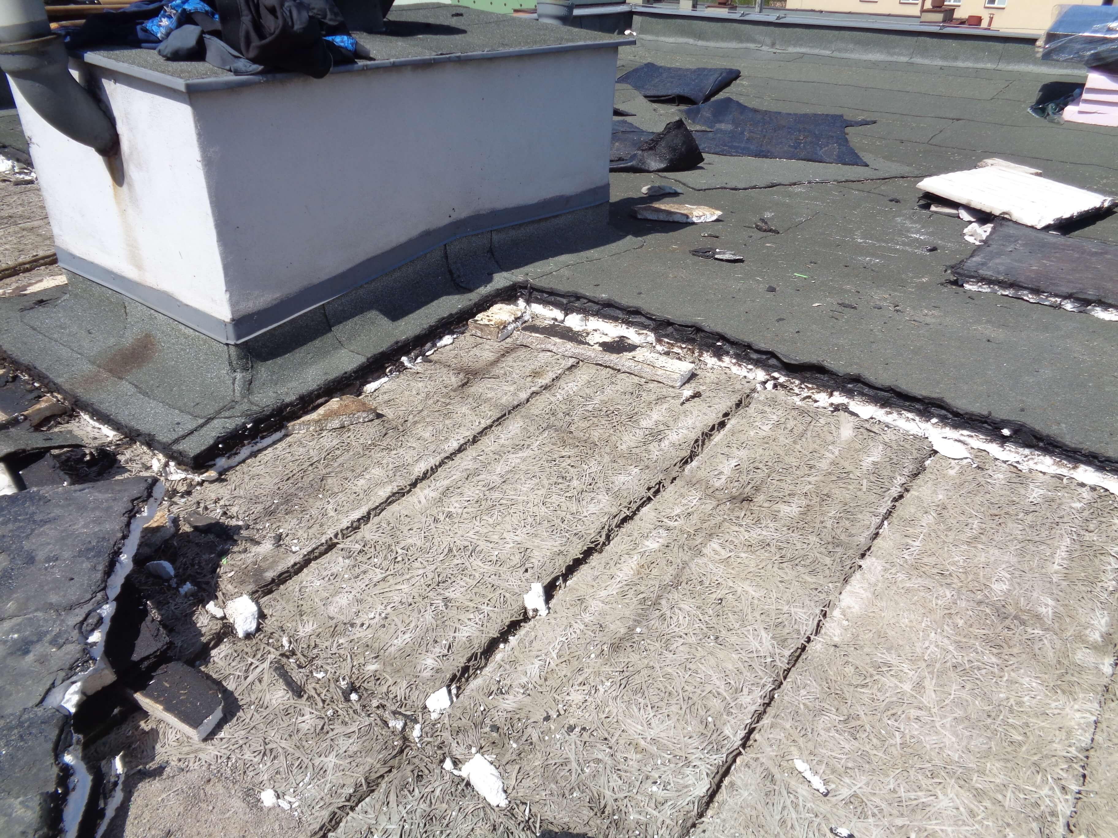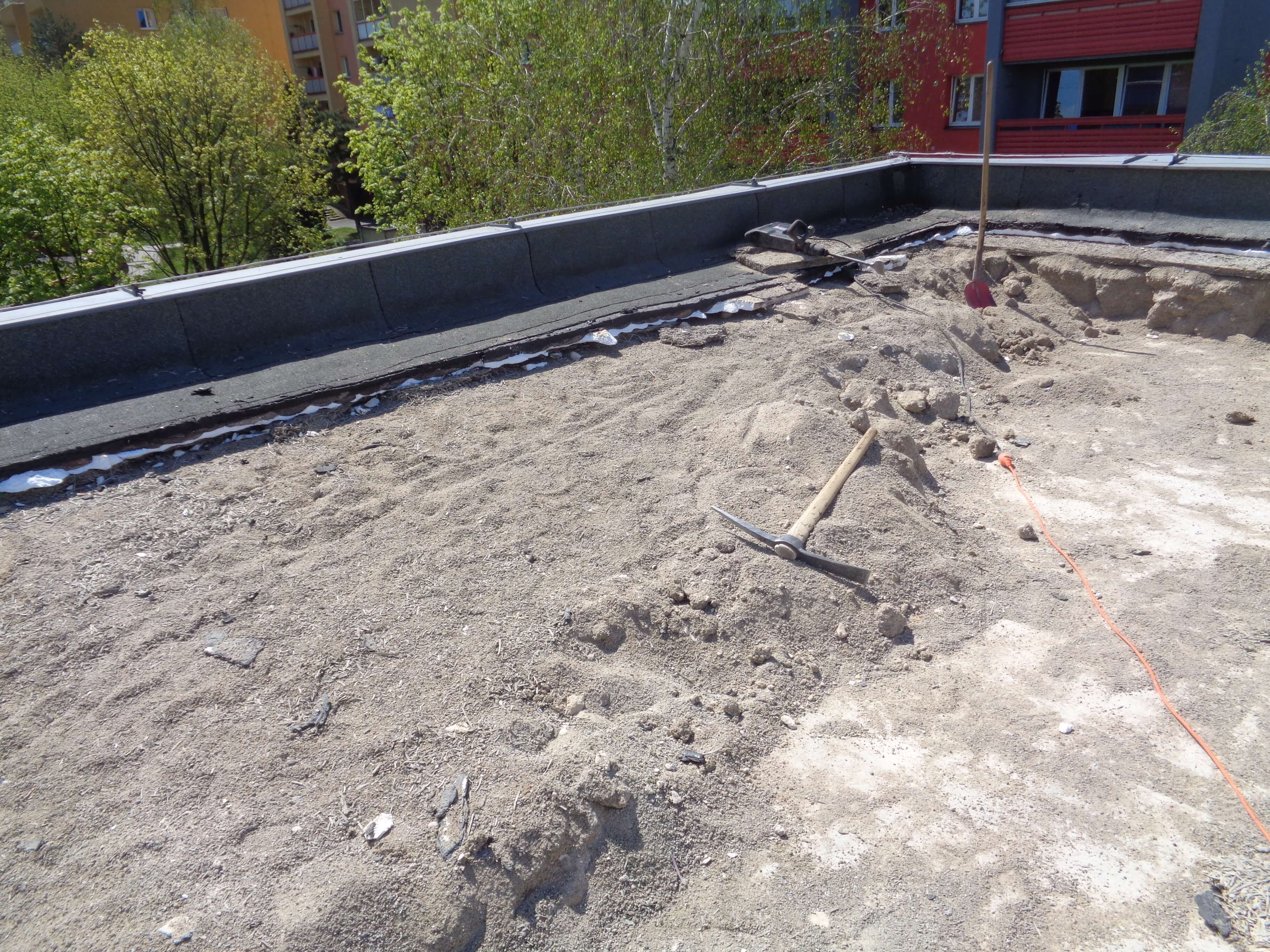 Na násypu byly položeny desky z heraklitu, desky POLSID z polystyrenu (foto 2) a několik vrstev asfaltových pásů. Vrstva násypu u atik byla vysoká až 400 mm (foto 3). V násypu se nacházely také cihly, které v minulosti tvořily systém větracích kanálků (foto 4). Odstraňování starých vrstev střechy probíhalo po etapách. Ihned po odtěžení vrstev se na nosné konstrukci prováděla provizorní hydroizolační vrstva z asfaltového pásu (foto 5). Při deštích se na provizorní hydroizolaci tvořily velké kaluže (foto 6). I přes všechna opatření došlo lokálně k zatečení do interiéru bytů (foto 8). Po odtěžení vrstev střechy byly na podkladu nerovnosti až 40 mm (foto 7), se kterými si izolatéři museli při realizaci poradit. S ohledem na deštivé období na jaře 2019 trvalo odstraňování střechy 2 měsíce.
